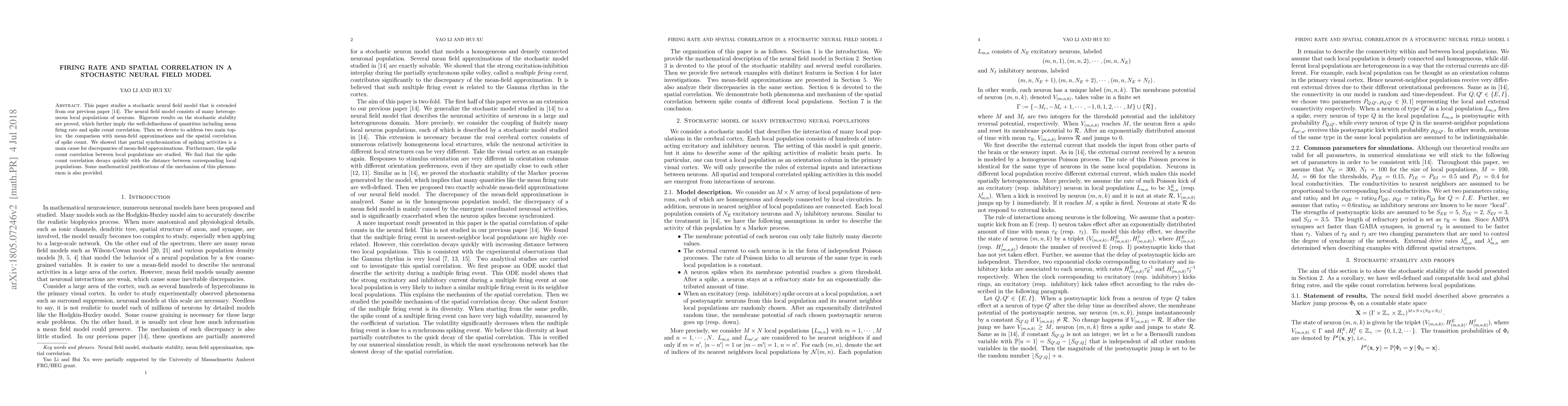 This paper studies a stochastic neural field model that is extended from our previous paper [14]. The neural field model consists of many heterogeneous local populations of neurons. Rigorous results on the stochastic stability are proved, which further imply the well-definedness of quantities including mean firing rate and spike count correlation. Then we devote to address two main topics: the comparison with mean-field approximations and the spatial correlation of spike count. We showed that partial synchronization of spiking activities is a main cause for discrepancies of mean-field approximations. Furthermore, the spike count correlation between local populations are studied. We find that the spike count correlation decays quickly with the distance between corresponding local populations. Some mathematical justifications of the mechanism of this phenomenon is also provided.