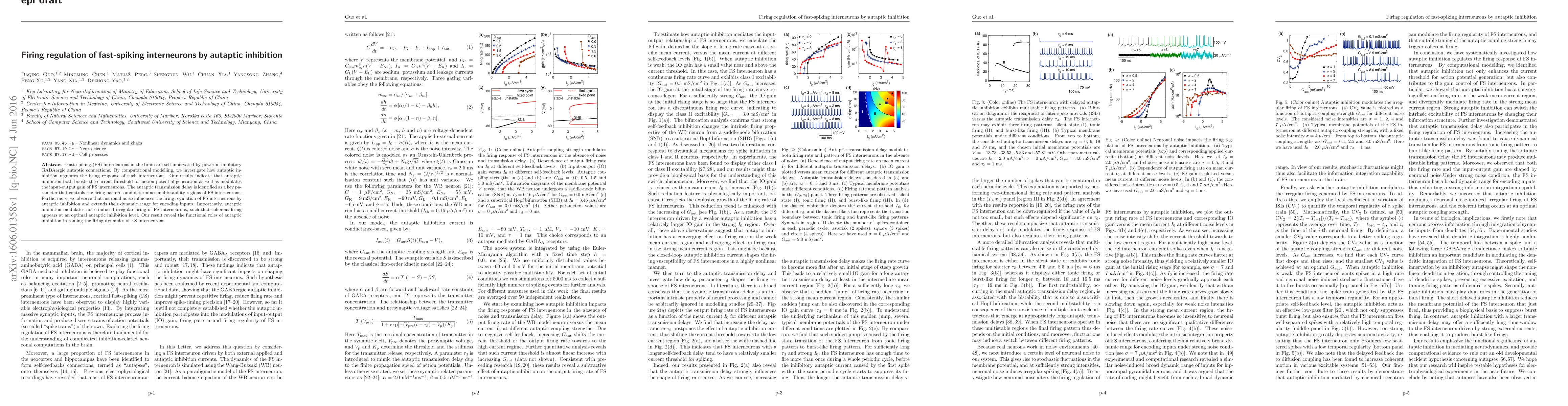 Fast-spiking (FS) interneurons in the brain are self-innervated by powerful inhibitory GABAergic autaptic connections. By computational modelling, we investigate how autaptic inhibition regulates the firing response of such interneurons. Our results indicate that autaptic inhibition both boosts the current threshold for action potential generation as well as modulates the input-output gain of FS interneurons. The autaptic transmission delay is identified as a key parameter that controls the firing patterns and determines multistability regions of FS interneurons. Furthermore, we observe that neuronal noise influences the firing regulation of FS interneurons by autaptic inhibition and extends their dynamic range for encoding inputs. Importantly, autaptic inhibition modulates noise-induced irregular firing of FS interneurons, such that coherent firing appears at an optimal autaptic inhibition level. Our result reveal the functional roles of autaptic inhibition in taming the firing dynamics of FS interneurons.