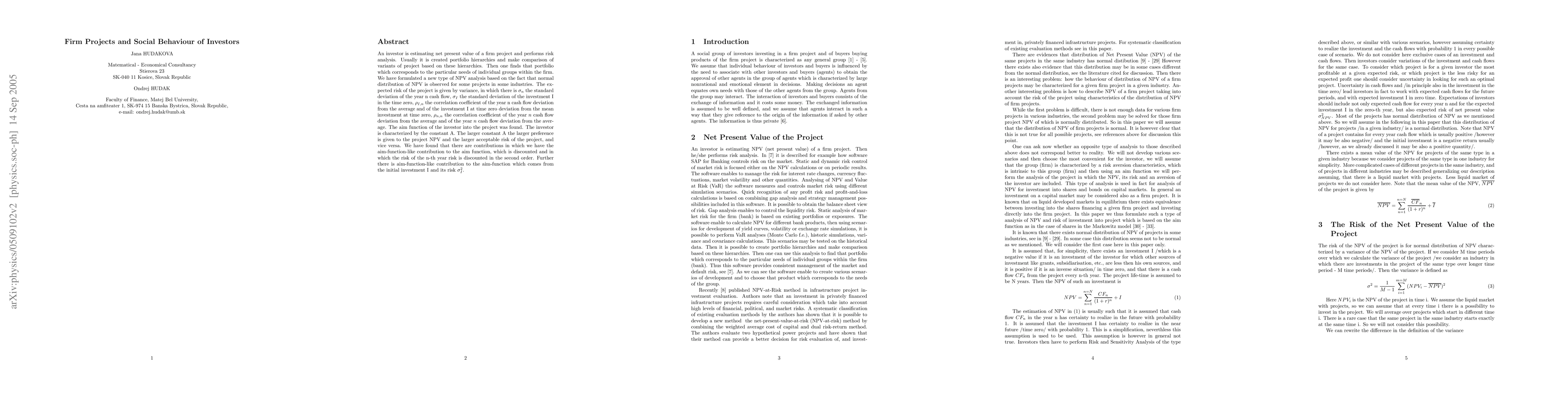 This paper introduces a new NPV analysis method for firm projects, considering the normal distribution of NPV in certain industries. It formulates an aim function for investors, incorporating variance and standard deviations of cash flows and investments, and their correlations, to assess project risk and preference based on a constant A.