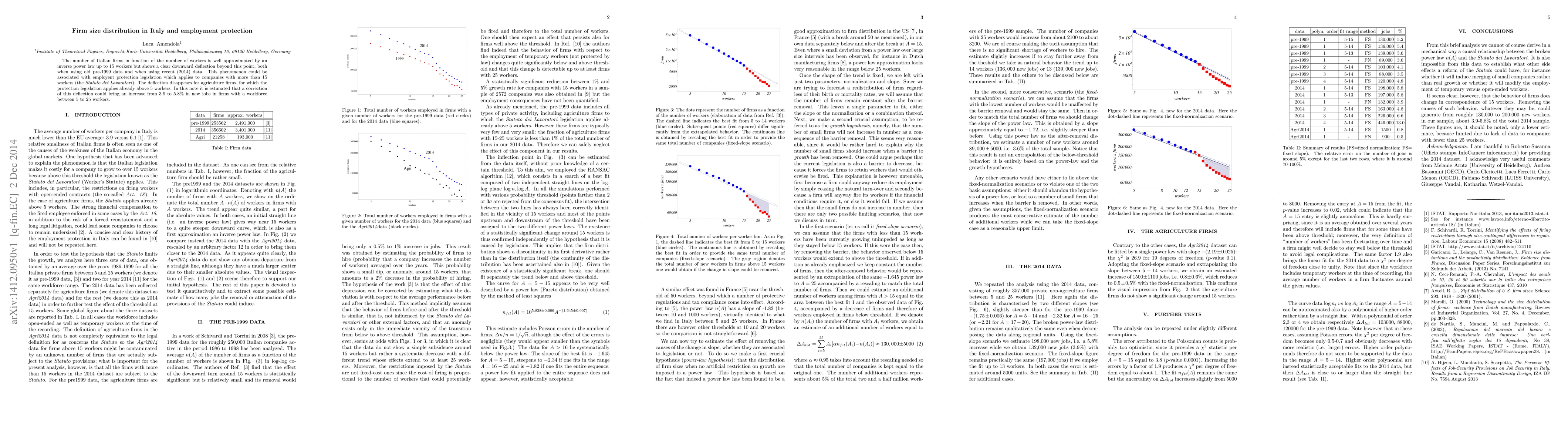 The number of Italian firms in function of the number of workers is well approximated by an inverse power law up to 15 workers but shows a clear downward deflection beyond this point, both when using old pre-1999 data and when using recent (2014) data. This phenomenon could be associated with employent protection legislation which applies to companies with more than 15 workers (the Statuto dei Lavoratori). The deflection disappears for agriculture firms, for which the protection legislation applies already above 5 workers. In this note it is estimated that a correction of this deflection could bring an increase from 3.9 to 5.8% in new jobs in firms with a workforce between 5 to 25 workers.