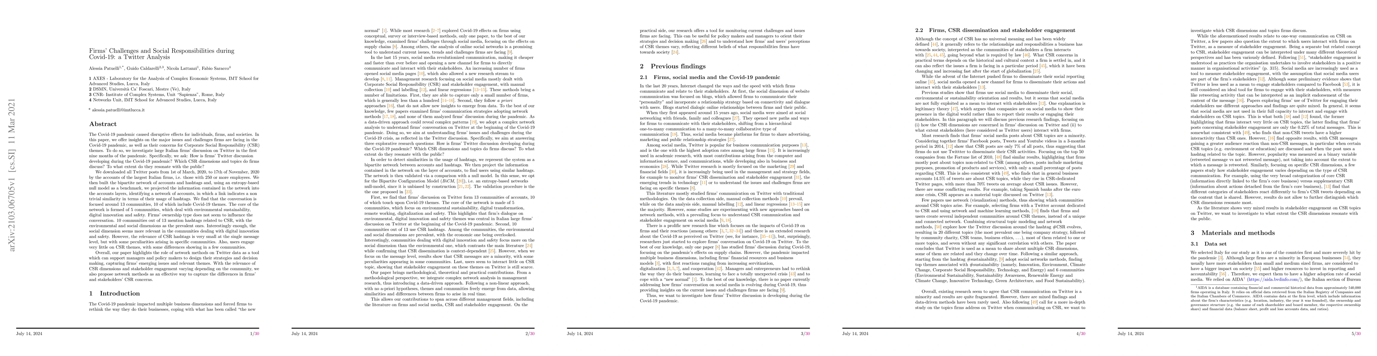 The Covid-19 pandemic caused disruptive effects for individuals, firms, and societies. In this paper, we offer insights on the major issues and challenges firms are facing in the Covid-19 pandemic, as well as their concerns for Corporate Social Responsibility (CSR) themes. To do so, we investigate large Italian firms' discussion on Twitter in the first nine months of the pandemic. We downloaded all Twitter posts from 1st of March, 2020, to 17th of November, 2020 by the accounts of the largest Italian firms, i.e. those with 250 or more employees. We then built the bipartite network of accounts and hashtags and, using an entropy-based null model as a benchmark, we projected the information contained in the network into the accounts layers, identifying a network of accounts in which a link indicates a non trivial similarity in terms of their usage of hashtags. We find that the conversation is focused around 13 communities, 10 of which include Covid-19 themes. The core of the network is formed of 5 communities, which deal with environmental sustainability, digital innovation and safety. Firms' ownership type does not seem to influence the conversation. 10 communities out of 13 mention hashtags related to CSR, with the environmental and social dimensions as the prevalent ones. Interestingly enough, the social dimension seems more relevant in the communities dealing with digital innovation and safety. However, the relevance of CSR hashtags is very small at the single message level, but with some peculiarities arising in specific communities. Overall, our paper highlights the role of network methods on Twitter data as a tool which can support managers and policy makers to design their strategies and decision making, capturing firms' emerging issues and relevant themes.