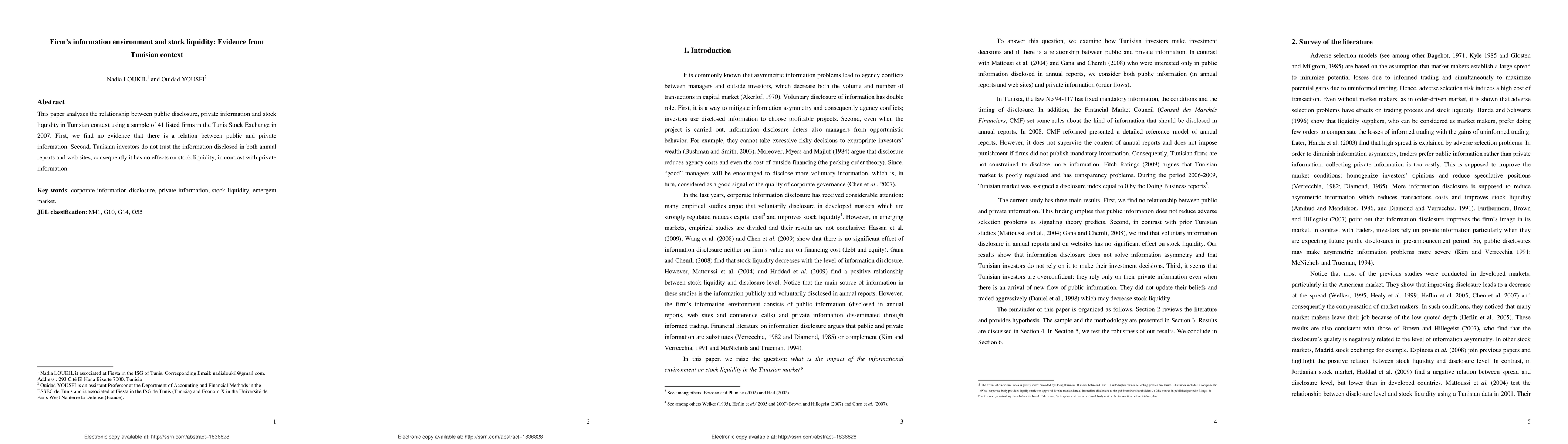 This paper analyzes the relationship between public disclosure, private information and stock liquidity in Tunisian context using a sample of 41 listed firms in the Tunis Stock Exchange in 2007. First, we find no evidence that there is a relation between public and private information. Second, Tunisian investors do not trust the information disclosed in both annual reports and web sites, consequently it has no effects on stock liquidity, in contrast with private information.