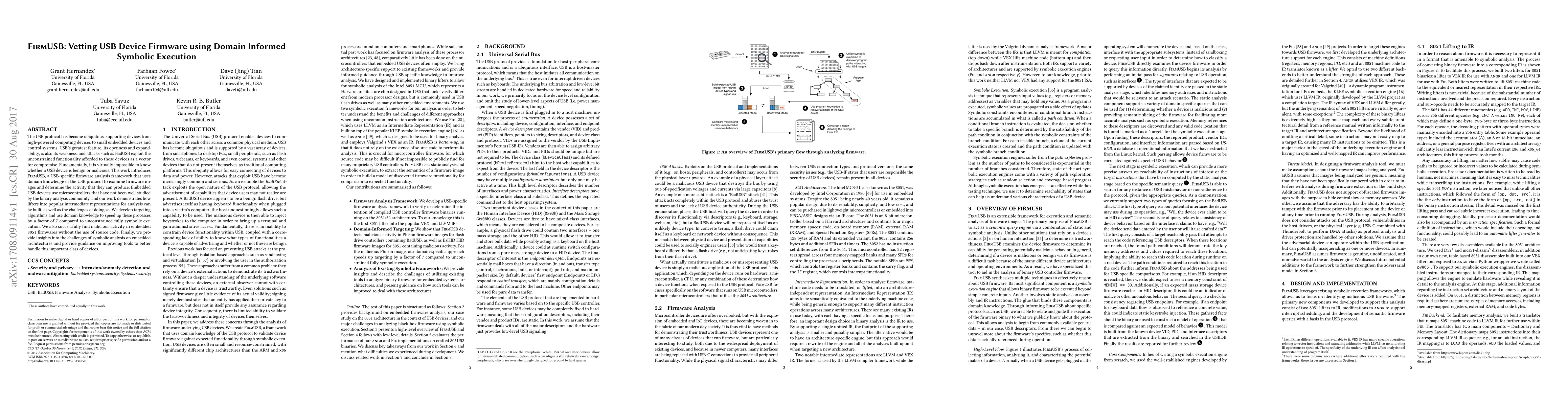 FirmUSB is a novel framework for vetting USB device firmware using domain-informed symbolic execution, which significantly speeds up the analysis by a factor of 7 compared to traditional methods, successfully identifying malicious activities in embedded 8051 firmwares without source code. The study also highlights challenges in symbolic analysis for embedded microcontrollers and offers guidance for improving related tools.