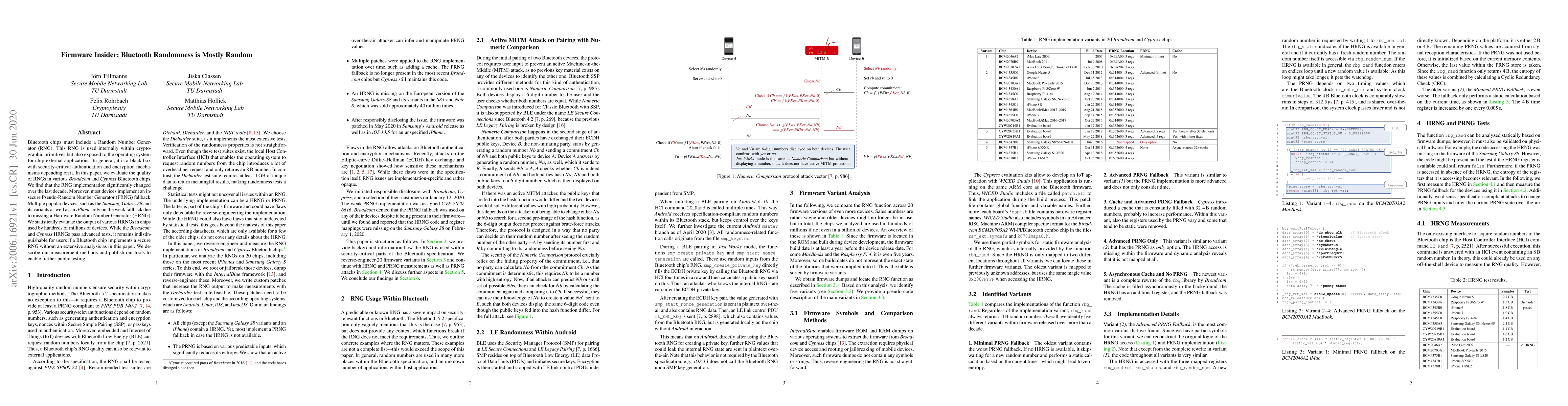Bluetooth chips must include a Random Number Generator (RNG). This RNG is used internally within cryptographic primitives but also exposed to the operating system for chip-external applications. In general, it is a black box with security-critical authentication and encryption mechanisms depending on it. In this paper, we evaluate the quality of RNGs in various Broadcom and Cypress Bluetooth chips. We find that the RNG implementation significantly changed over the last decade. Moreover, most devices implement an insecure Pseudo-Random Number Generator (PRNG) fallback. Multiple popular devices, such as the Samsung Galaxy S8 and its variants as well as an iPhone, rely on the weak fallback due to missing a Hardware Random Number Generator (HRNG). We statistically evaluate the output of various HRNGs in chips used by hundreds of millions of devices. While the Broadcom and Cypress HRNGs pass advanced tests, it remains indistinguishable for users if a Bluetooth chip implements a secure RNG without an extensive analysis as in this paper. We describe our measurement methods and publish our tools to enable further public testing.