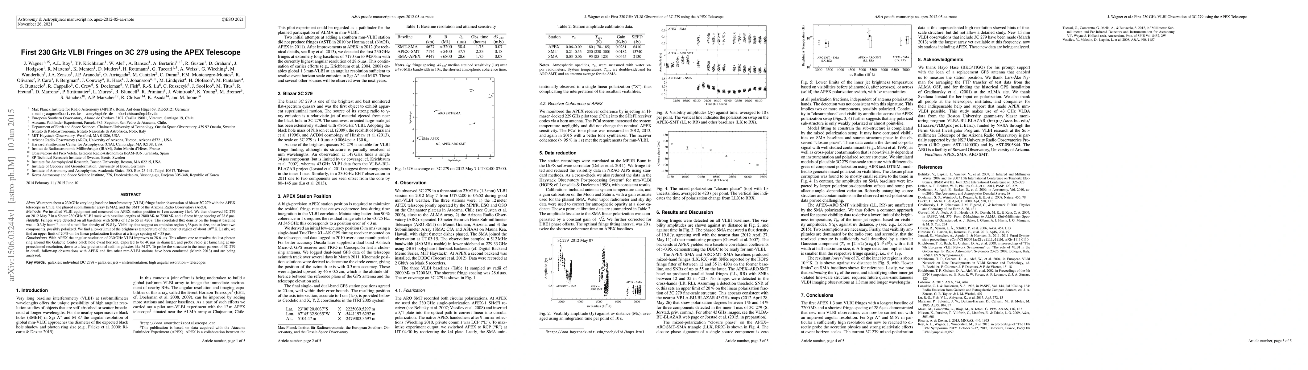 This research details the first 230 GHz VLBI fringe observation of blazar 3C 279 using APEX telescope, SMA, and SMT. Fringes detected on all baselines, indicating a compact emission region (<38 micro-arcseconds) and a brightness temperature of at least 10^10 K. The study also sets an upper limit of 20% on the linear polarization fraction and highlights the potential of APEX for resolving structures near supermassive black holes and probing jet launching zones.