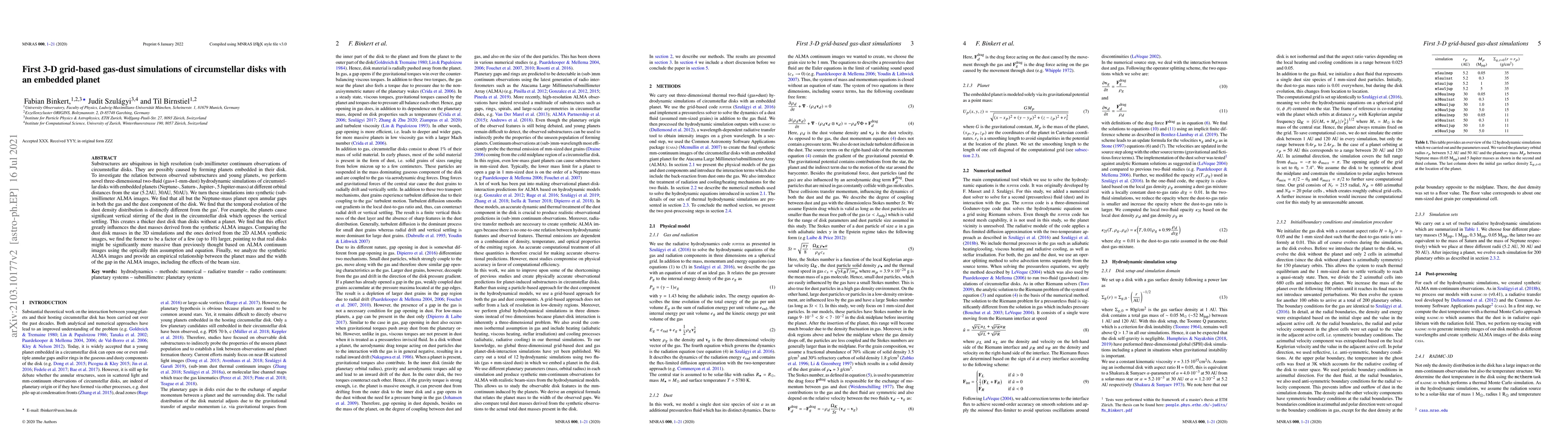 Substructures are ubiquitous in high resolution (sub-)millimeter continuum observations of circumstellar disks. They are possibly caused by forming planets embedded in the disk. To investigate the relation between observed substructures and young planets, we perform novel three-dimensional two-fluid (gas+1-mm-dust) hydrodynamic simulations of circumstellar disks with embedded planets (Neptune-, Saturn-, Jupiter-, 5 Jupiter-mass) at different orbital distances from the star (5.2AU, 30AU, 50AU). We turn these simulations into synthetic (sub-)millimeter ALMA images. We find that all but the Neptune-mass planet open annular gaps in both the gas and the dust component of the disk. We find that the temporal evolution of the dust density distribution is distinctly different of the gas'. For example, the planets cause significant vertical stirring of the dust in the circumstellar disk which opposes the vertical settling. This creates a thicker dust disk than disks without a planet. We find that this effect greatly influences the dust masses derived from the synthetic ALMA images. Comparing the dust disk masses in the 3D simulations and the ones derived from the 2D ALMA synthetic images, we find the former to be a factor of a few (up to 10) larger, pointing to that real disks might be significantly more massive than previously thought based on ALMA continuum images using the optically thin assumption and equation. Finally, we analyze the synthetic ALMA images and provide an empirical relationship between the planet mass and the width of the gap in the ALMA images including the effects of the beam size.