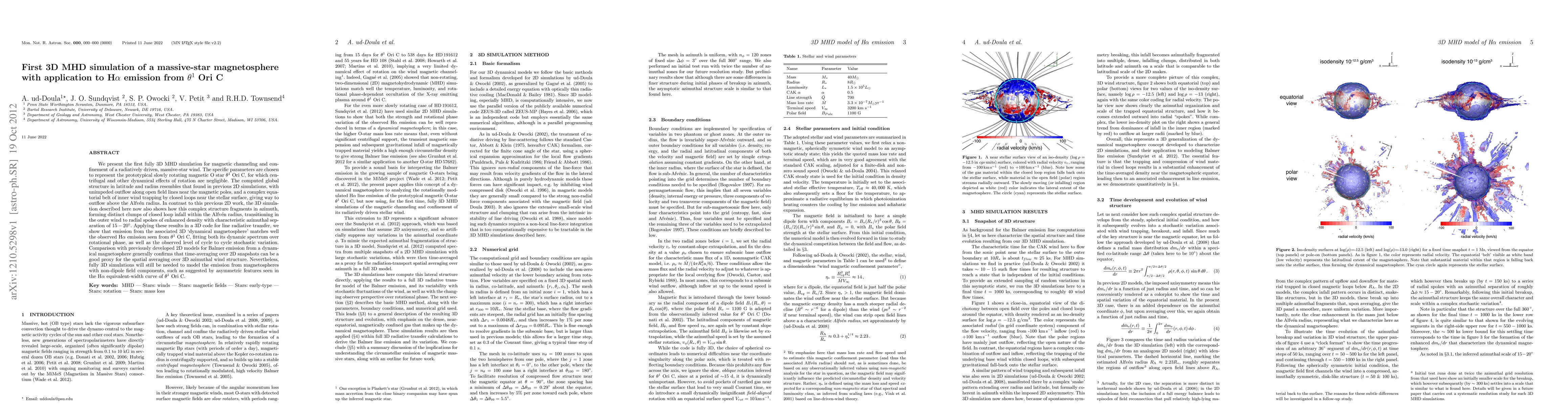 We present the first fully 3D MHD simulation for magnetic channeling and confinement of a radiatively driven, massive-star wind. The specific parameters are chosen to represent the prototypical slowly rotating magnetic O star \theta^1 Ori C, for which centrifugal and other dynamical effects of rotation are negligible. The computed global structure in latitude and radius resembles that found in previous 2D simulations, with unimpeded outflow along open field lines near the magnetic poles, and a complex equatorial belt of inner wind trapping by closed loops near the stellar surface, giving way to outflow above the Alfv\'{e}n radius. In contrast to this previous 2D work, the 3D simulation described here now also shows how this complex structure fragments in azimuth, forming distinct clumps of closed loop infall within the Alfv\'{e}n radius, transitioning in the outer wind to radial spokes of enhanced density with characteristic azimuthal separation of $15-20 \degr$. Applying these results in a 3D code for line radiative transfer, we show that emission from the associated 3D `dynamical magnetosphere' matches well the observed H\alpha emission seen from \theta^1 Ori C, fitting both its dynamic spectrum over rotational phase, as well as the observed level of cycle to cycle stochastic variation. Comparison with previously developed 2D models for Balmer emission from a dynamical magnetosphere generally confirms that time-averaging over 2D snapshots can be a good proxy for the spatial averaging over 3D azimuthal wind structure. Nevertheless, fully 3D simulations will still be needed to model the emission from magnetospheres with non-dipole field components, such as suggested by asymmetric features seen in the H\alpha equivalent-width curve of \theta^1 Ori C.