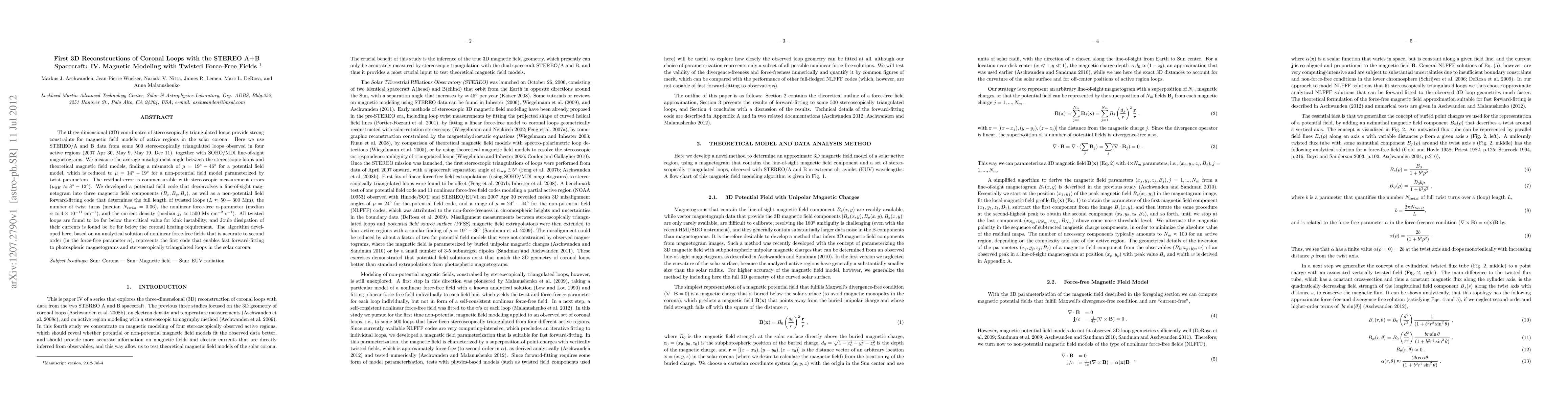 The three-dimensional (3D) coordinates of stereoscopically triangulated loops provide strong constraints for magnetic field models of active regions in the solar corona. Here we use STEREO/A and B data from some 500 stereoscopically triangulated loops observed in four active regions (2007 Apr 30, May 9, May 19, Dec 11), together with SOHO/MDI line-of-sight magnetograms. We measure the average misalignment angle between the stereoscopic loops and theoretical magnetic field models, finding a mismatch of $\mu=19^\circ-46^\circ$ for a potential field model, which is reduced to $\mu=14^\circ-19^\circ$ for a non-potential field model parameterized by twist parameters. The residual error is commensurable with stereoscopic measurement errors ($\mu_{SE} \approx 8^\circ-12^\circ$). We developed a potential field code that deconvolves a line-of-sight magnetogram into three magnetic field components $(B_x, B_y, B_z)$, as well as a non-potential field forward-fitting code that determines the full length of twisted loops ($L \approx 50-300$ Mm), the number of twist turns (median $N_{twist}=0.06$), the nonlinear force-free $\alpha$-parameter (median $\alpha \approx 4 \times 10^{-11}$ cm$^{-1}$), and the current density (median $j_z \approx 1500$ Mx cm$^{-2}$ s$^{-1}$). All twisted loops are found to be far below the critical value for kink instability, and Joule dissipation of their currents is found be be far below the coronal heating requirement. The algorithm developed here, based on an analytical solution of nonlinear force-free fields that is accurate to second order (in the force-free parameter $\alpha$), represents the first code that enables fast forward-fitting to photospheric magnetograms and stereoscopically triangulated loops in the solar corona.