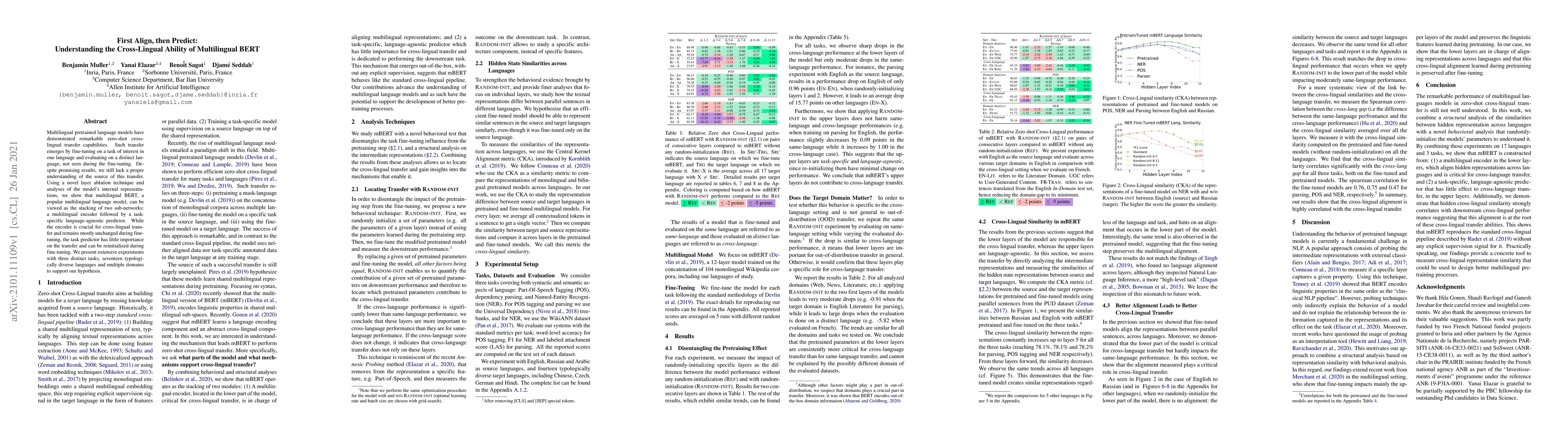 This paper investigates the cross-lingual transfer capabilities of multilingual BERT, revealing that its performance stems from a multilingual encoder and a task-specific predictor. The encoder is vital for cross-lingual ability, while the predictor can be reinitialized during fine-tuning without affecting transfer.