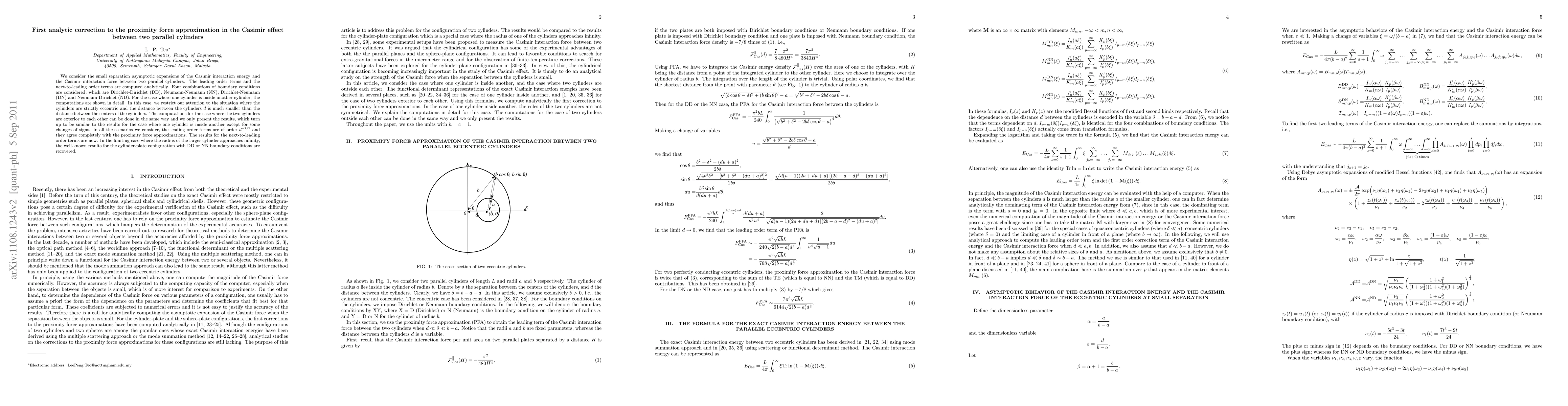 We consider the small separation asymptotic expansions of the Casimir interaction energy and the Casimir interaction force between two parallel cylinders. The leading order terms and the next-to-leading order terms are computed analytically. Four combinations of boundary conditions are considered, which are Dirichlet-Dirichlet (DD), Neumann-Neumann (NN), Dirichlet-Neumann (DN) and Neumann-Dirichlet (ND). For the case where one cylinder is inside another cylinder, the computations are shown in detail. In this case, we restrict our attention to the situation where the cylinders are strictly eccentric and the distance between the cylinders $d$ is much smaller than the distance between the centers of the cylinders. The computations for the case where the two cylinders are exterior to each other can be done in the same way and we only present the results, which turn up to be similar to the results for the case where one cylinder is inside another except for some changes of signs. In all the scenarios we consider, the leading order terms are of order $d^{-7/2}$ and they agree completely with the proximity force approximations. The results for the next-to-leading order terms are new. In the limiting case where the radius of the larger cylinder approaches infinity, the well-known results for the cylinder-plate configuration with DD or NN boundary conditions are recovered.