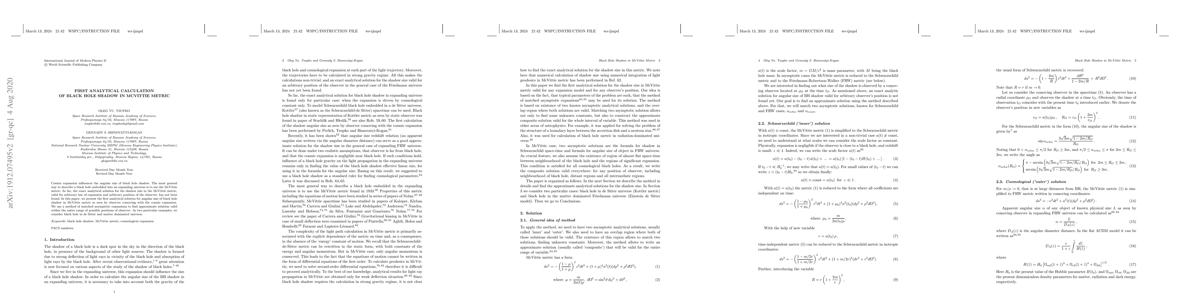This paper presents the first analytical solution for the angular size of a black hole shadow in the McVittie metric, describing a black hole in an expanding universe. The authors use matched asymptotic expansions to derive an approximate solution valid for various observer positions and apply it to de Sitter and matter-dominated universes.