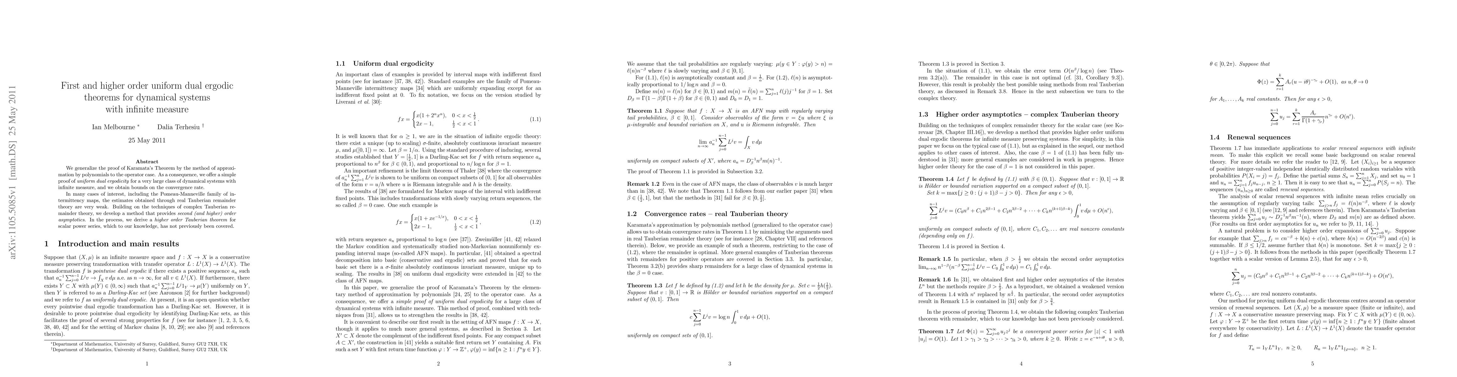 We generalize the proof of Karamata's Theorem by the method of approximation by polynomials to the operator case. As a consequence, we offer a simple proof of \emph{uniform dual ergodicity} for a very large class of dynamical systems with infinite measure, and we obtain bounds on the convergence rate. In many cases of interest, including the Pomeau-Manneville family of intermittency maps, the estimates obtained through real Tauberian remainder theory are very weak. Building on the techniques of complex Tauberian remainder theory, we develop a method that provides \emph{second (and higher) order asymptotics}. In the process, we derive a \emph{higher order Tauberian theorem} for scalar power series, which to our knowledge, has not previously been covered.