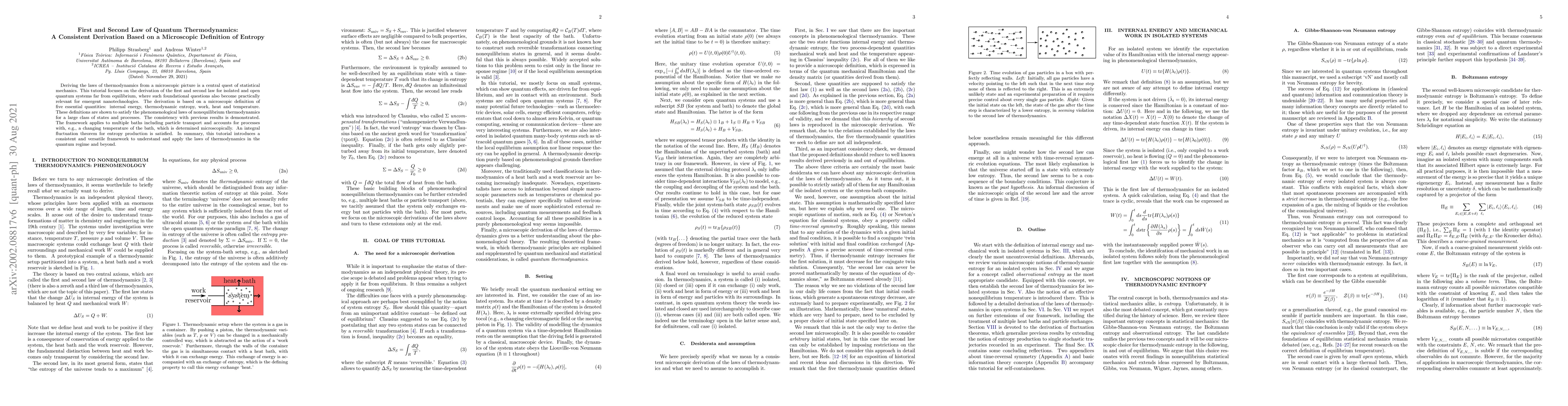 Deriving the laws of thermodynamics from a microscopic picture is a central quest of statistical mechanics. This tutorial focuses on the derivation of the first and second law for closed and open quantum systems far from equilibrium, where such foundational questions also become practically relevant for emergent nanotechnologies. The derivation is based on a microscopic definition of five essential quantities: internal energy, thermodynamic entropy, work, heat and temperature. These definitions are shown to satisfy the phenomenological laws of nonequilibrium thermodynamics for a large class of states and processes. The consistency with previous results is demonstrated. The framework applies to multiple baths including particle transport and accounts for processes with, e.g., a changing temperature of the bath, which is determined microscopically. An integral fluctuation theorem for entropy production is satisfied. In summary, this tutorial introduces a consistent and versatile framework to understand and apply the laws of thermodynamics in the quantum regime and beyond.