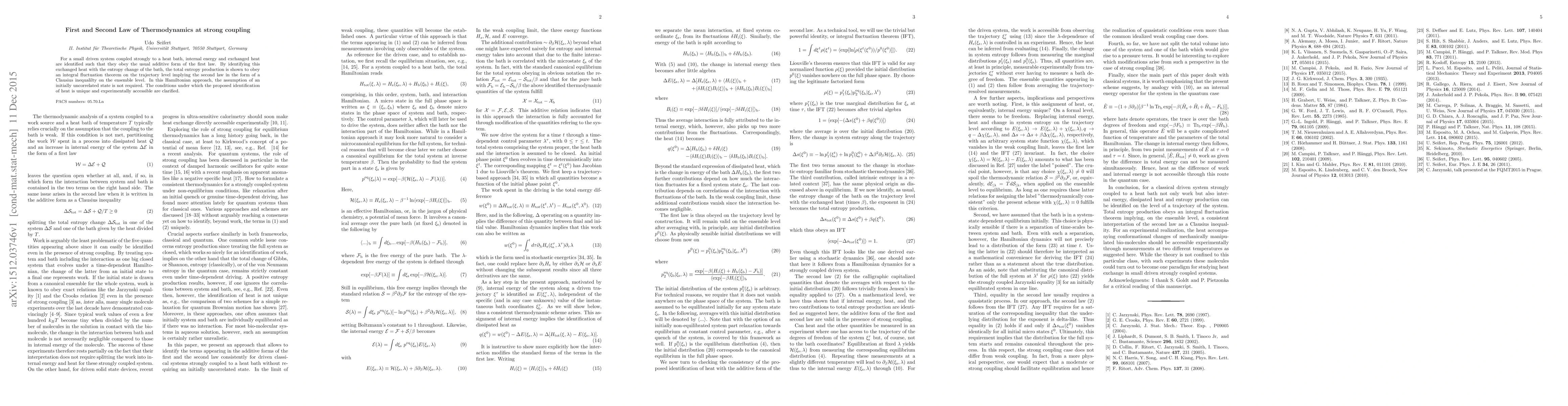 For a small driven system coupled strongly to a heat bath, internal energy and exchanged heat are identified such that they obey the usual additive form of the first law. By identifying this exchanged heat with the entropy change of the bath, the total entropy production is shown to obey an integral fluctuation theorem on the trajectory level implying the second law in the form of a Clausius inequalilty on the ensemble level. In this Hamiltonian approach, the assumption of an initially uncorrelated state is not required. The conditions under which the proposed identification of heat is unique and experimentally accessible are clarified.