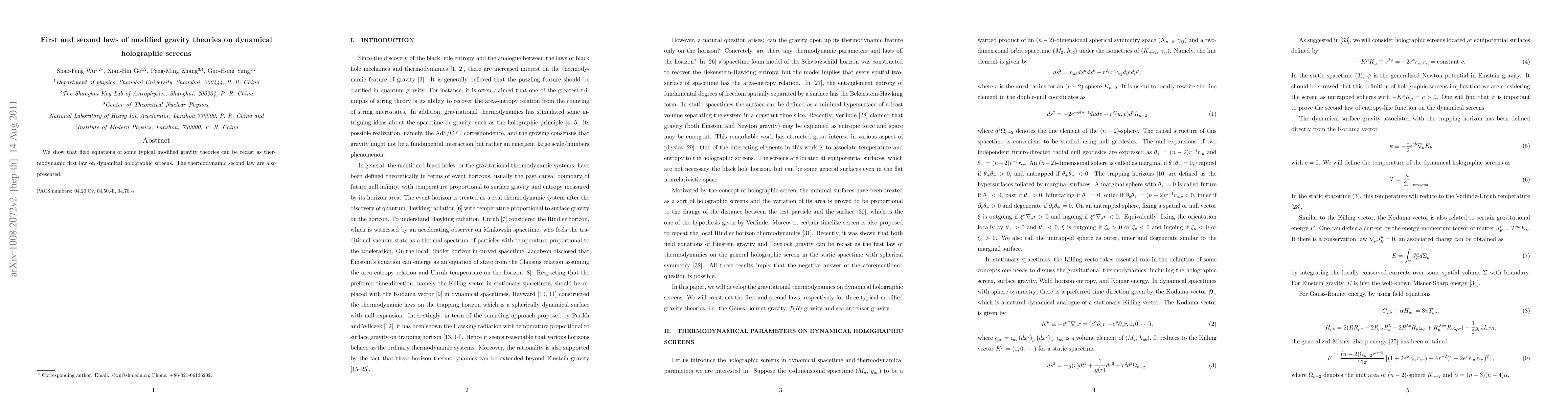We show that field equations of some typical modified gravity theories can be recast as thermodynamic first law on dynamical holographic screens. The thermodynamic second law are also presented.