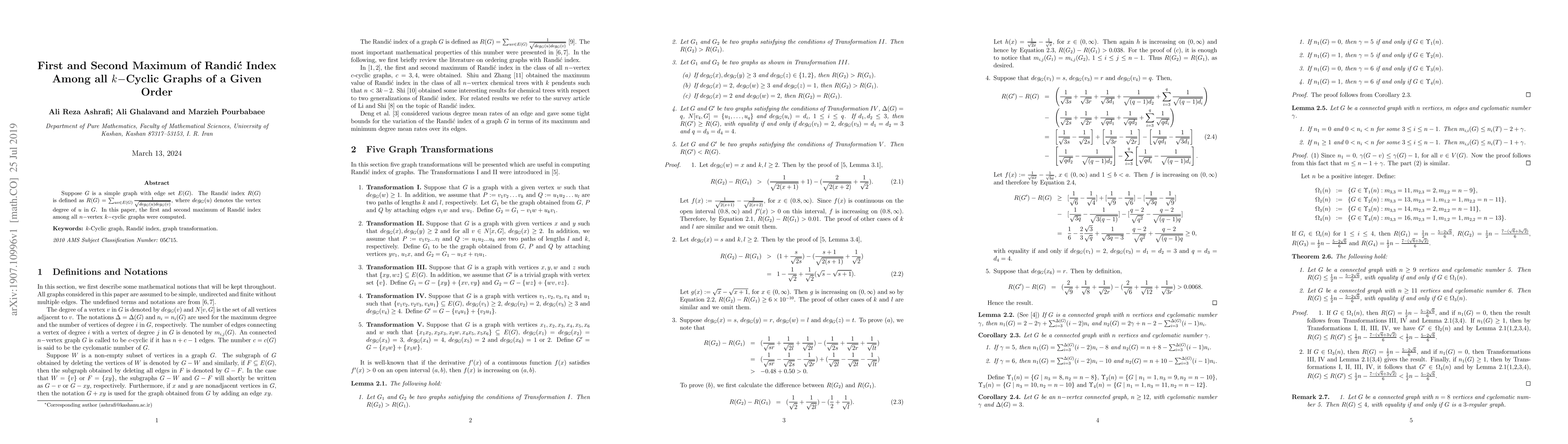 Suppose $G$ is a simple graph with edge set $E(G)$. The Randi\'{c} index $R(G)$ is defined as $R(G)=\sum_{uv\in E(G)}\frac{1}{\sqrt{deg_{G}(u)deg_{G}(v)}}$, where $deg_G(u)$ denotes the vertex degree of $u$ in $G$. In this paper, the first and second maximum of Randi\'{c} index among all $n-$vertex $k-$cyclic graphs were computed.