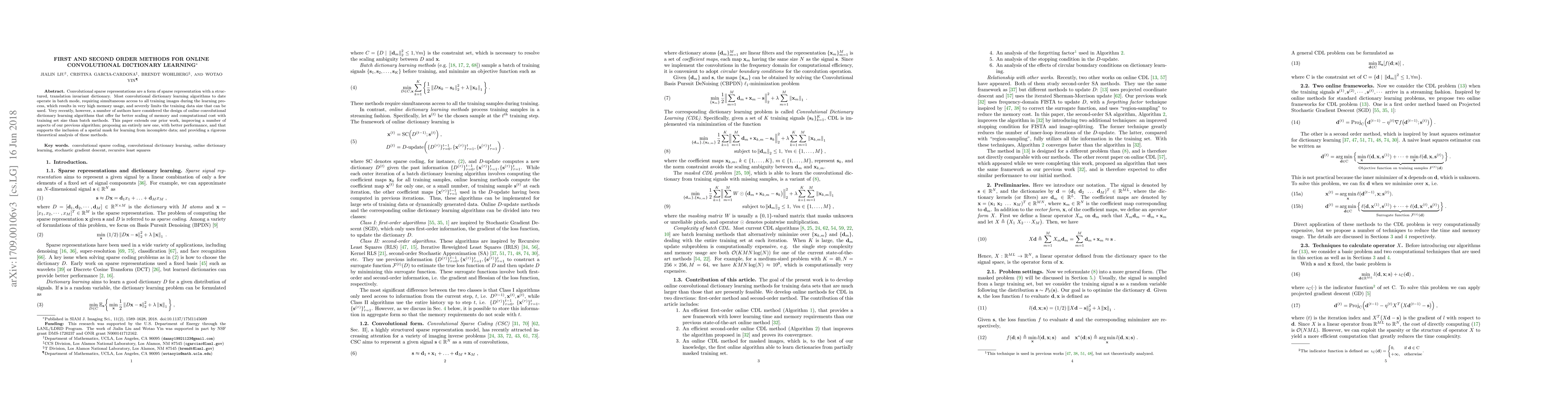 This paper proposes improved first and second order methods for online convolutional dictionary learning, offering better scalability and performance compared to batch methods. It also introduces a new algorithm that supports learning from incomplete data and provides a rigorous theoretical analysis.