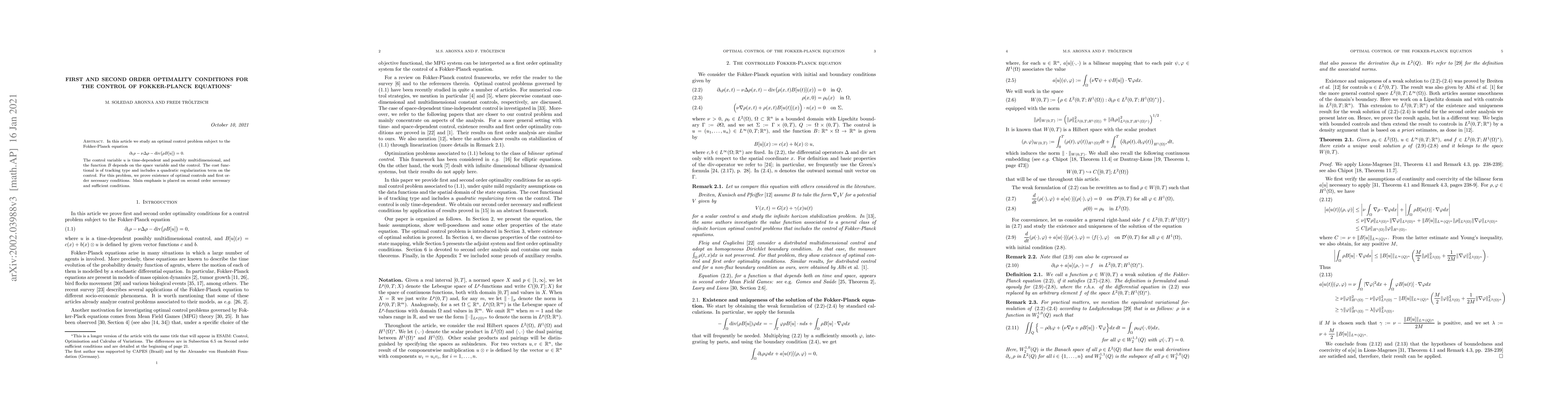 In this article we study an optimal control problem subject to the Fokker-Planck equation \[ \partial_t \rho - \nu \Delta \rho - {\rm div } \big(\rho B[u]\big) = 0. \] The control variable $u$ is time-dependent and possibly multidimensional, and the function $B$ depends on the space variable and the control. The cost functional is of tracking type and includes a quadratic regularization term on the control. For this problem, we prove existence of optimal controls and first order necessary conditions. Main emphasis is placed on second order necessary and sufficient conditions.
