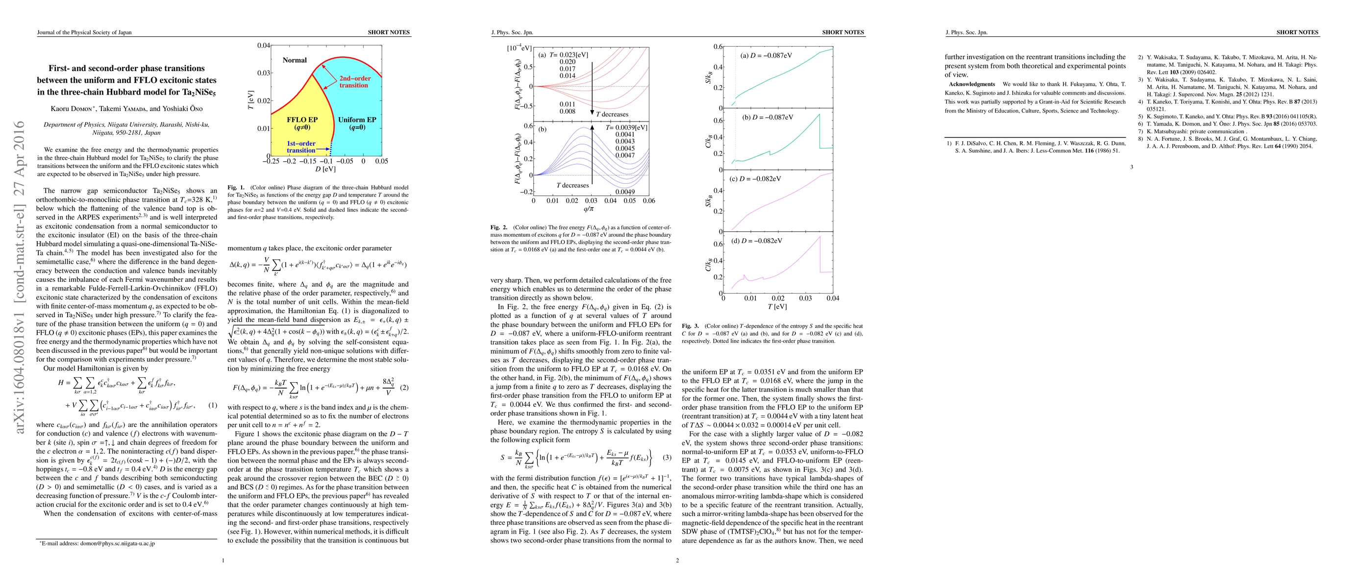 This research investigates the thermodynamic properties and phase transitions in the three-chain Hubbard model for Ta2NiSe5, revealing first- and second-order transitions between uniform and FFLO excitonic states under high pressure conditions. The study aims to clarify the expected behavior of Ta2NiSe5 in such environments.
