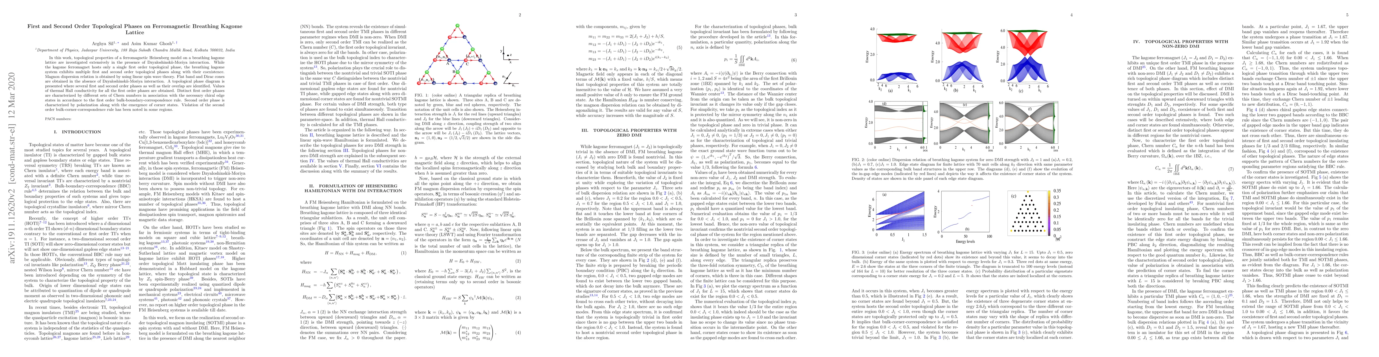 This paper investigates topological phases in a ferromagnetic Heisenberg model on a breathing kagome lattice with Dzyaloshinskii-Moriya interaction, revealing multiple first and second order topological phases, including their coexistence, and characterizing them via magnon dispersion, Chern numbers, and thermal Hall conductivity.