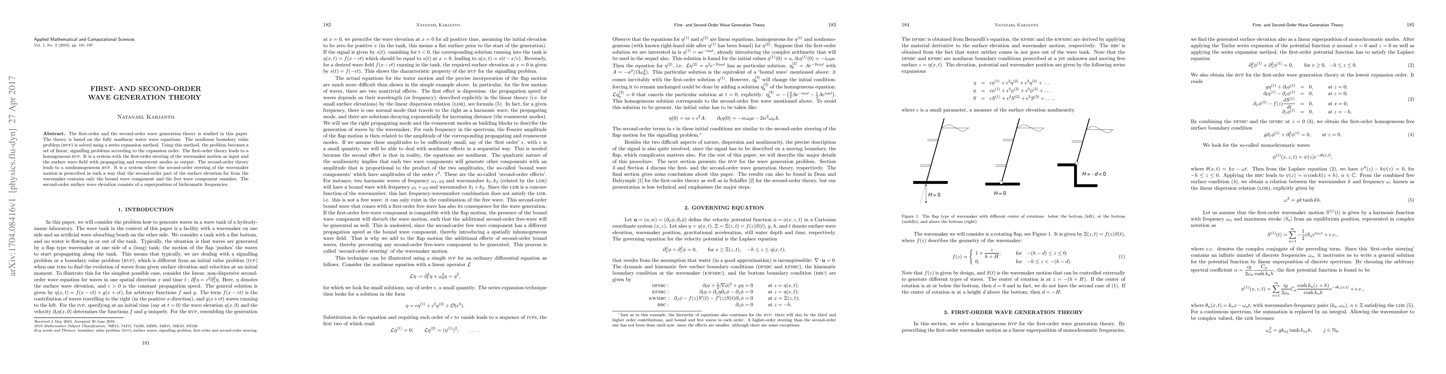 The first-order and the second-order wave generation theory is studied in this paper. The theory is based on the fully nonlinear water wave equations. The nonlinear boundary value problem (BVP) is solved using a series expansion method. Using this method, the problem becomes a set of linear, signalling problems according to the expansion order. The first-order theory leads to a homogeneous BVP. It is a system with the first-order steering of the wavemaker motion as input and the surface wave field with propagating and evanescent modes as output. The second-order theory leads to a nonhomogeneous BVP. It is a system where the second-order steering of the wavemaker motion is prescribed in such a way that the second-order part of the surface elevation far from the wavemaker contains only the bound wave component and the free wave component vanishes. The second-order surface wave elevation consists of a superposition of bichromatic frequencies.