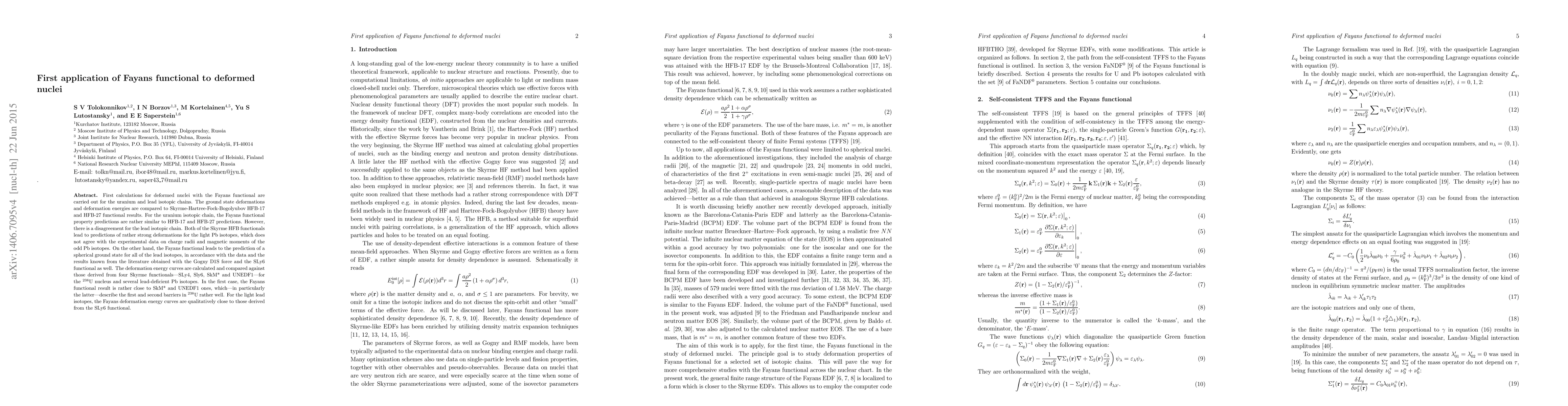 This paper presents initial applications of the Fayans functional to deformed nuclei, comparing its predictions for uranium and lead isotopic chains to Skyrme-Hartree-Fock-Bogolyubov results. The Fayans functional shows similar deformation properties for uranium but predicts spherical ground states for lead isotopes, aligning with experimental data, unlike the Skyrme functionals.