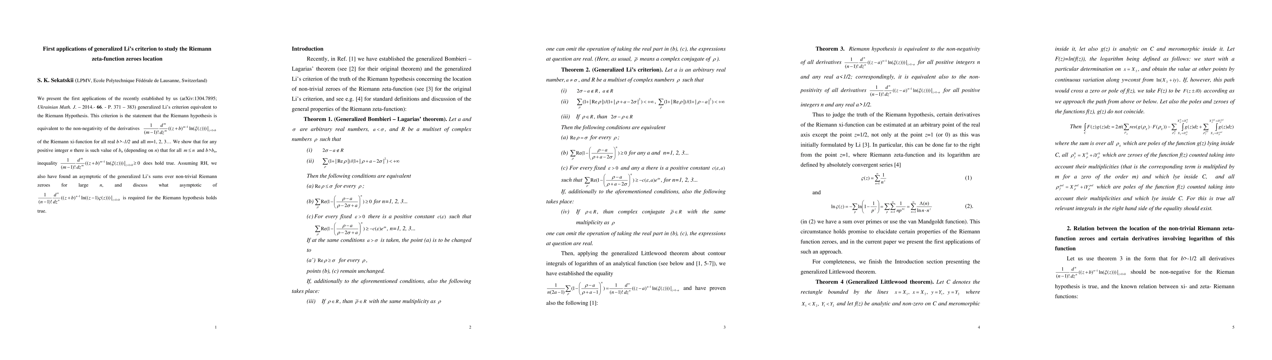 We present the first applications of the recently established by us (arXiv:1304.7895; Ukrainian Math. J. - 2014. -66. - P. 371-383) generalized Li's criterion equivalent to the Riemann Hypothesis. This criterion is the statement that the Riemann hypothesis is equivalent to the non-negativity of the derivatives 1/((m-1)!)*d^m/dz^m((z+b)^(m-1)*ln(\xi(z))) for z=b+1 of the Riemann xi-function for all real b>-1/2 and all m = 1, 2, 3... We show that for any positive integer n there is such value of b_n (depending on n) that for all m<=n and b>b_n, inequality 1/((m-1)!)*d^m/dz^m((z+b)^(m-1)*ln(\xi(z))) for z=b+1 >=0 does hold true. Assuming RH, we also have found an asymptotic of the generalized Li's sums over non-trivial Rieman zeroes for large n, and discuss what asymptotic of 1/((m-1)!)*d^m/dz^m((z+b)^(m-1)*ln((z-1)*(\zeta(z))) at the point z+b+1 is required for the Riemann hypothesis holds true.