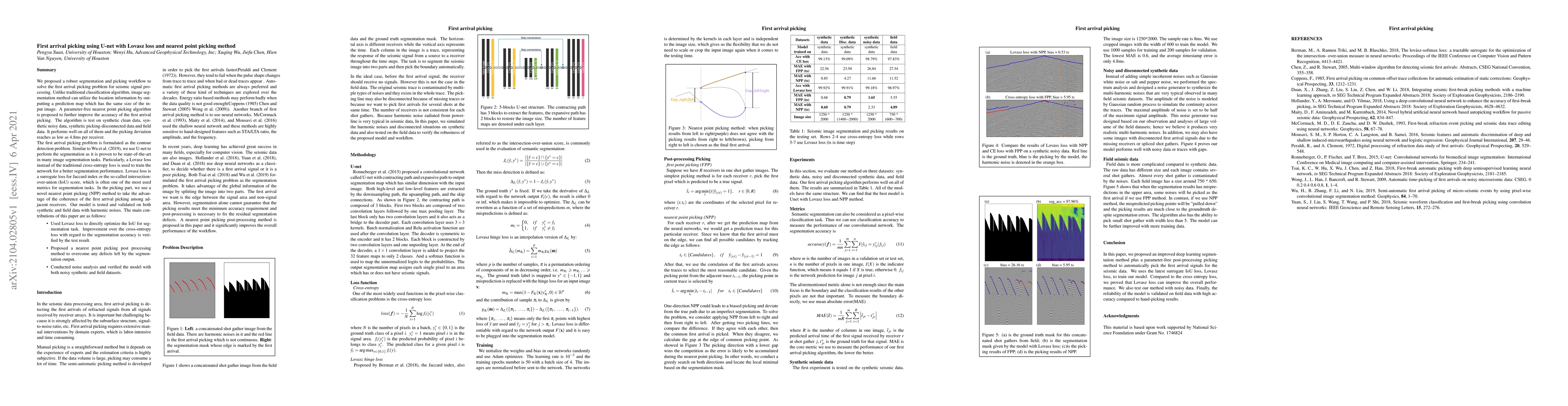 The paper introduces a novel workflow for first arrival picking in seismic signal processing, employing U-net with Lovasz loss for segmentation and a nearest point picking method. This approach outperforms traditional methods, achieving a low picking deviation of 4.8ms on field data, and effectively handles noisy data. Key contributions include using Lovasz loss for IoU optimization, proposing a nearest point picking method, and validating the model with synthetic and field datasets.