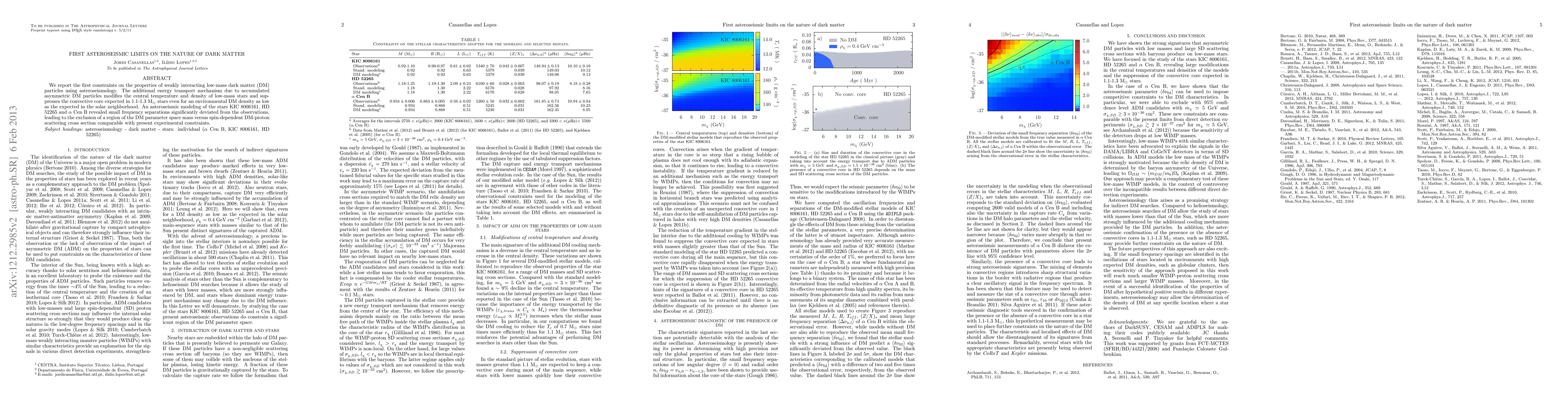 We report the first constraints on the properties of weakly interacting low-mass dark matter (DM) particles using asteroseismology. The additional energy transport mechanism due to accumulated asymmetric DM particles modifies the central temperature and density of low-mass stars and suppresses the convective core expected in 1.1-1.3 Ms stars even for an environmental DM density as low as the expected in the solar neighborhood. An asteroseismic modeling of the stars KIC 8006161, HD 52265 and Alpha Cen B revealed small frequency separations significantly deviated from the observations, leading to the exclusion of a region of the DM parameter space mass versus spin-dependent DM-proton scattering cross section comparable with present experimental constraints.