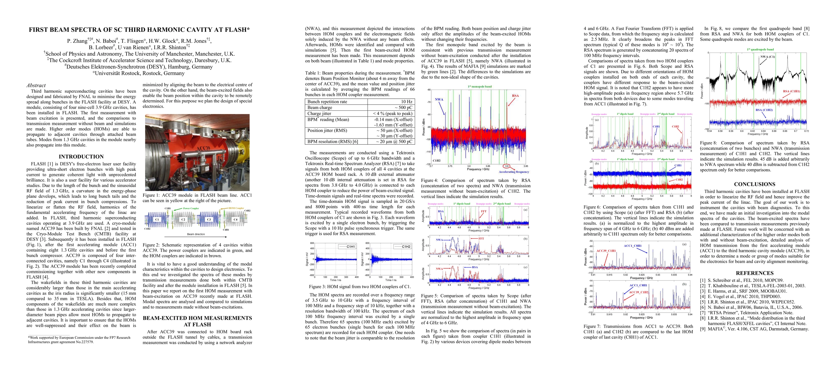 Third harmonic superconducting cavities have been designed and fabricated by FNAL to minimise the energy spread along bunches in the FLASH facility at DESY. A module, consisting of four nine-cell 3.9 GHz cavities, has been installed in FLASH. The first measurement with beam excitation is presented, and the comparisons to transmission measurement without beam and simulations are made. Higher order modes (HOMs) are able to propagate to adjacent cavities through attached beam tubes. Modes from 1.3 GHz cavities in the module nearby also propagate into this module.