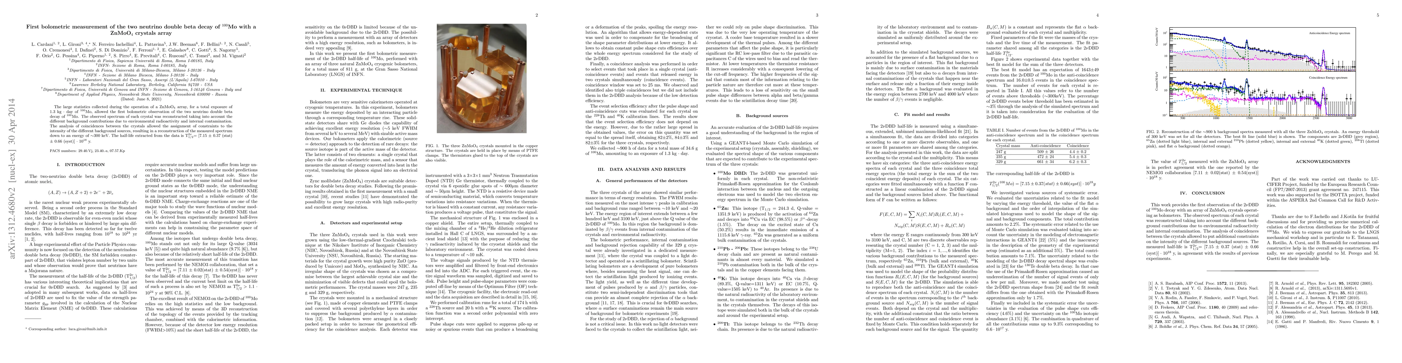 Researchers observed the two neutrino double beta decay of 100Mo for the first time using a ZnMoO4 crystal array, measuring a half-life of 7.15x10^18 years with high statistical accuracy.