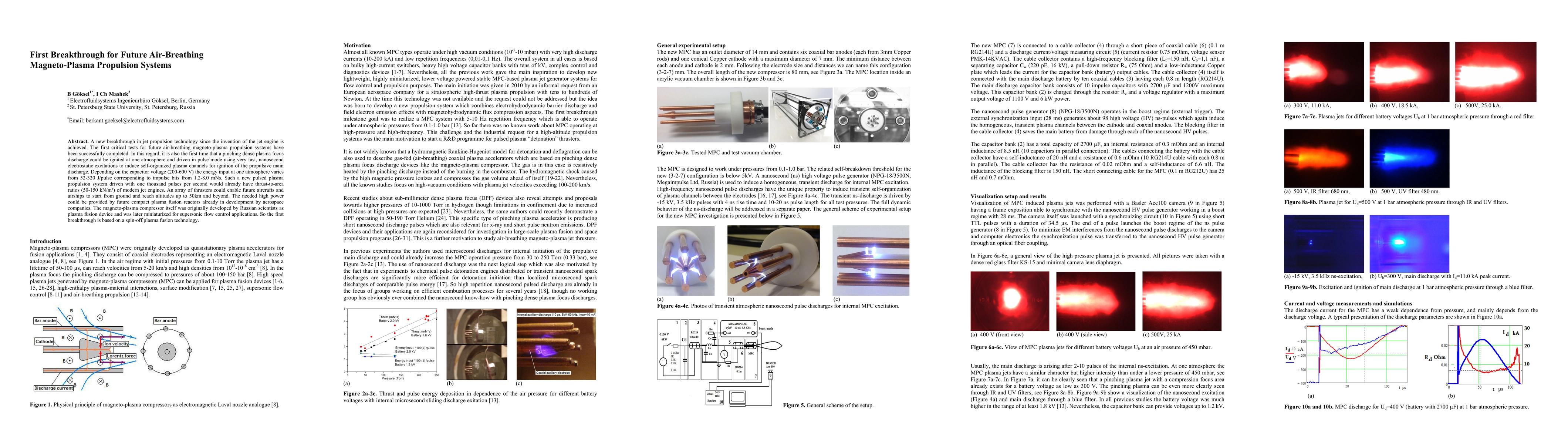 A new breakthrough in jet propulsion technology since the invention of the jet engine is achieved. The first critical tests for future air-breathing magneto-plasma propulsion systems have been successfully completed. In this regard, it is also the first time that a pinching dense plasma focus discharge could be ignited at one atmosphere and driven in pulse mode using very fast, nanosecond electrostatic excitations to induce self-organized plasma channels for ignition of the propulsive main discharge. Depending on the capacitor voltage (200-600 V) the energy input at one atmosphere varies from 52-320 J/pulse corresponding to impulse bits from 1.2-8.0 mNs. Such a new pulsed plasma propulsion system driven with one thousand pulses per second would already have thrust-to-area ratios (50-150 kN/m2) of modern jet engines. An array of thrusters could enable future aircrafts and airships to start from ground and reach altitudes up to 50km and beyond. The needed high power could be provided by future compact plasma fusion reactors already in development by aerospace companies. The magneto-plasma compressor itself was originally developed by Russian scientists as plasma fusion device and was later miniaturized for supersonic flow control applications. So the first breakthrough is based on a spin-off plasma fusion technology.