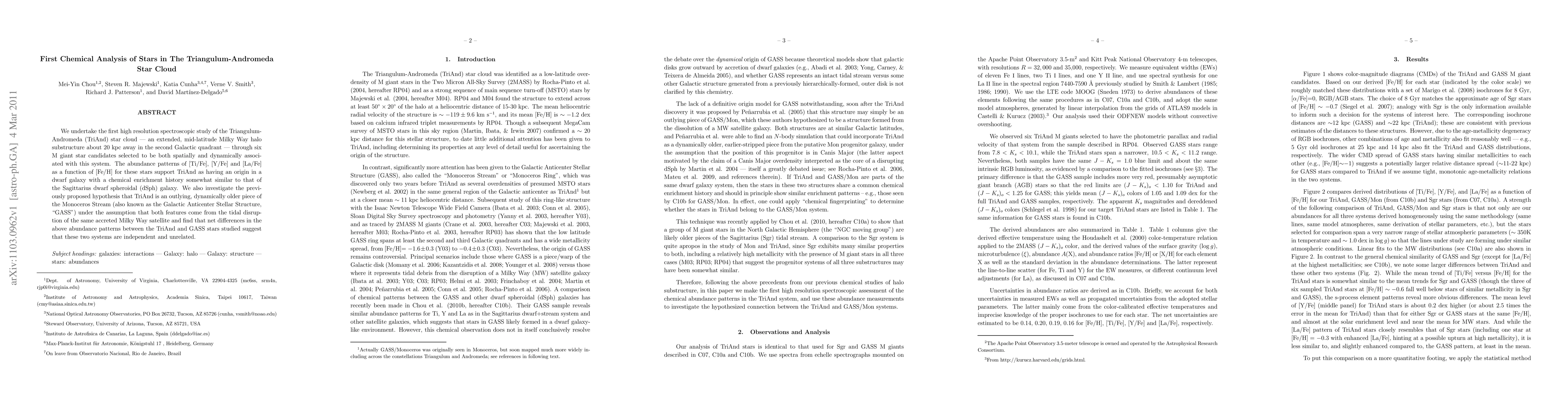 This study presents the first high-resolution spectroscopic analysis of the Triangulum-Andromeda star cloud, revealing chemical abundance patterns suggesting a dwarf galaxy origin similar to Sagittarius dSph. The research refutes the hypothesis linking TriAnd to the Monoceros Stream, indicating these systems are independent.