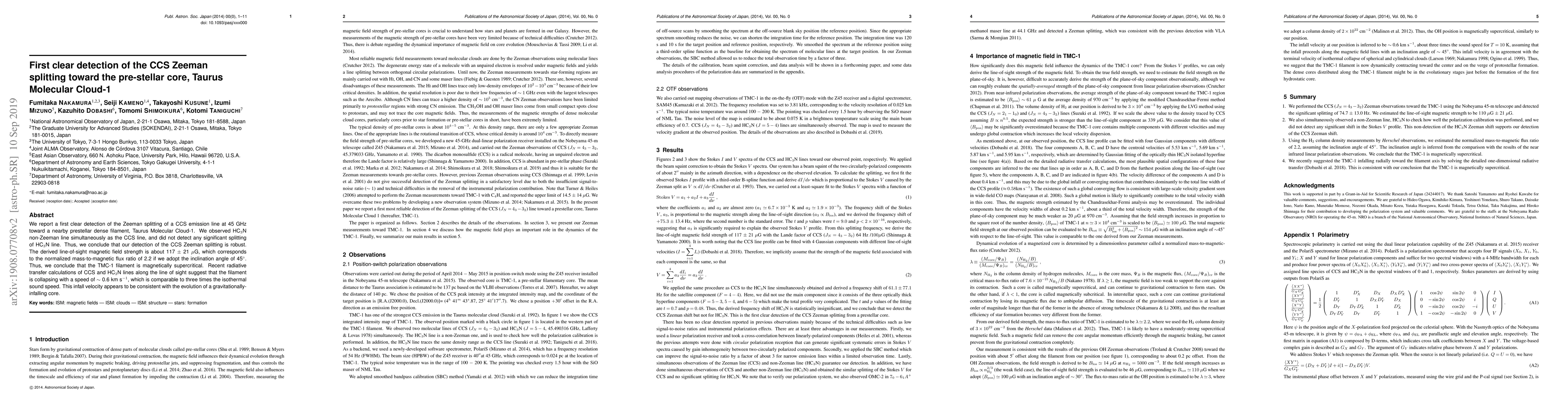 This paper reports the first clear detection of the Zeeman splitting of a CCS emission line in Taurus Molecular Cloud-1, indicating a magnetic field strength of about 117 $\pm$ 21 $\mu$G, suggesting the filament is magnetically supercritical. The observed infall velocity of $\sim$ 0.6 km s$^{-1}$ supports the filament's gravitational collapse.