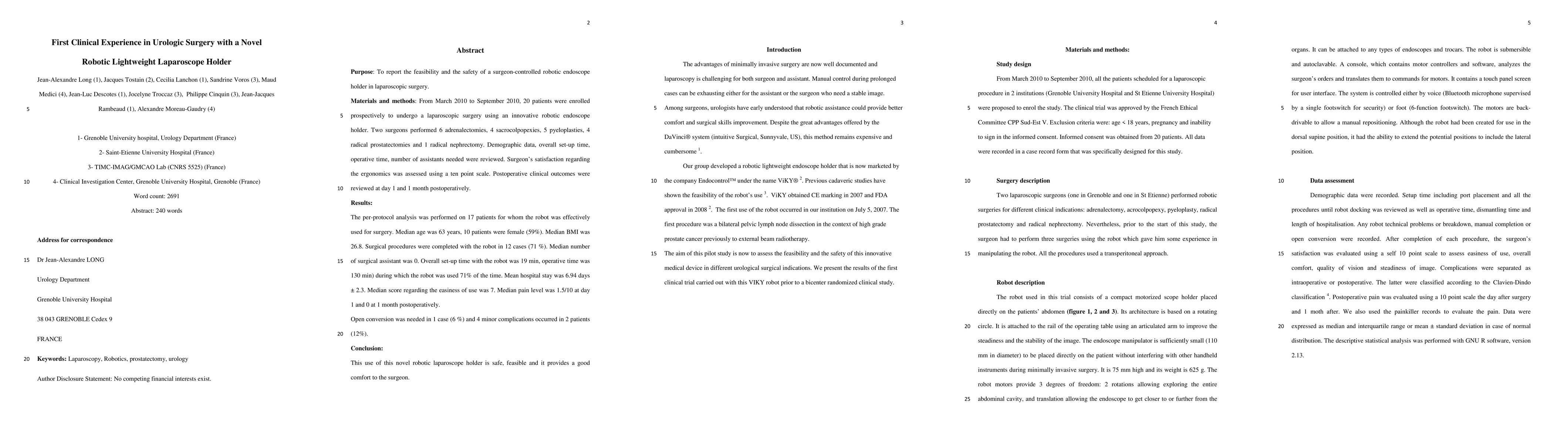 This study reports the first clinical experience with a novel robotic lightweight laparoscope holder in urologic surgery, demonstrating its feasibility, safety, and surgeon satisfaction. The robotic system was successfully used in 71% of procedures with minimal assistance and minor complications.
