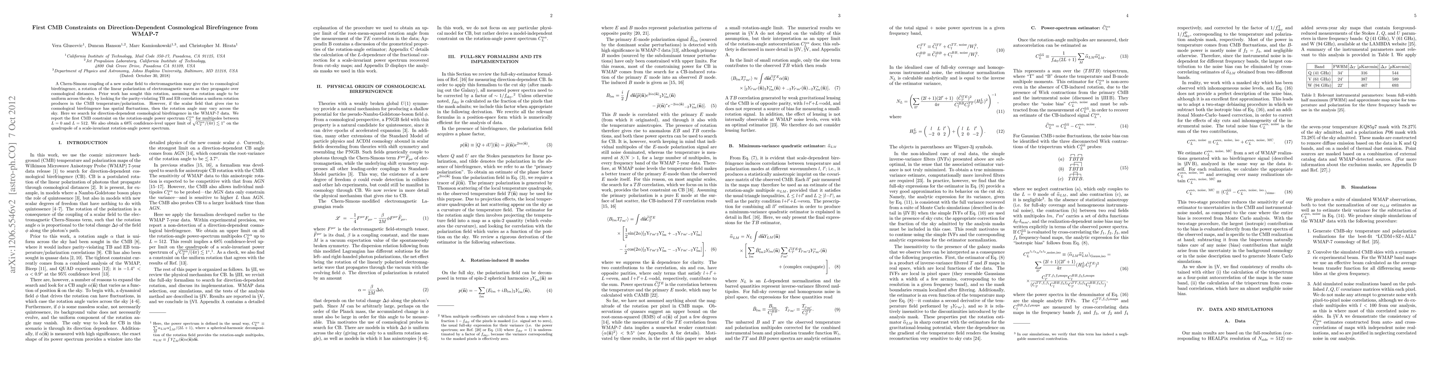 This paper investigates the possibility of direction-dependent cosmological birefringence using WMAP-7 data, finding the first CMB constraints on the rotation-angle power spectrum. It sets a 68% confidence-level upper limit of 1 degree on the square root of the quadrupole of a scale-invariant rotation-angle power spectrum.