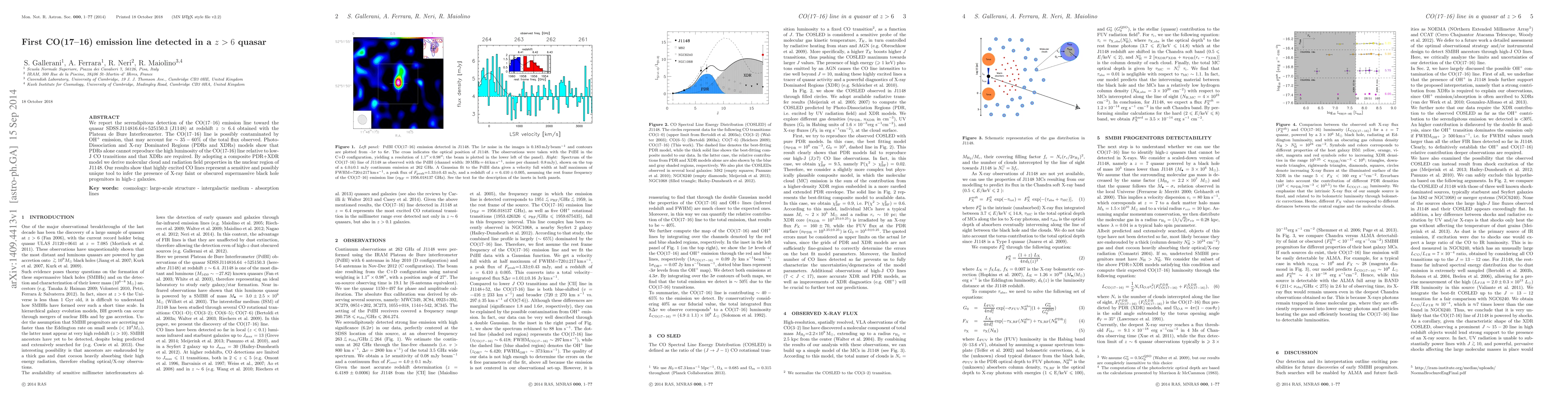 We report the serendipitous detection of the CO(17-16) emission line toward the quasar SDSSJ114816.64+525150.3 (J1148) at redshift z = 6.4 obtained with the Plateau de Bure Interferometer. The CO(17-16) line is possibly contaminated by OH+ emission, that may account for ~ 35 - 60% of the total flux observed. Photo-Dissociation and X-ray Dominated Regions (PDRs and XDRs) models show that PDRs alone cannot reproduce the high luminosity of the CO(17-16) line relative to low-J CO transitions and that XDRs are required. By adopting a composite PDR+XDR model we derive molecular cloud and radiation field properties in the nuclear region of J1148. Our results show that highly excited CO lines represent a sensitive and possibly unique tool to infer the presence of X-ray faint or obscured supermassive black hole progenitors in high-z galaxies.