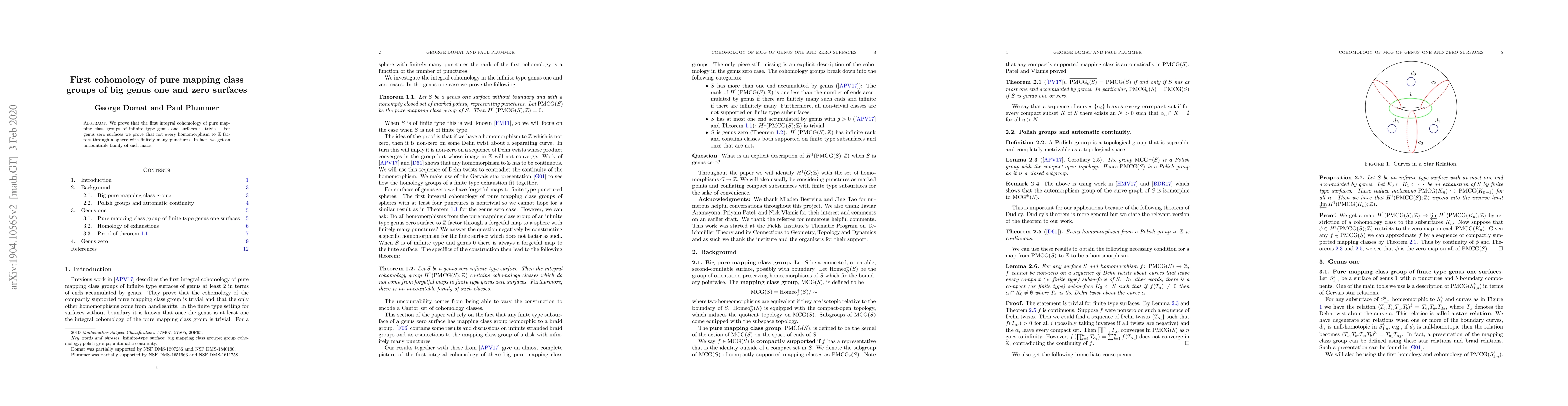 Summary: The first integral cohomology of pure mapping class groups for infinite type genus one surfaces is trivial. For genus zero surfaces, not all homomorphisms to $\mathbb{Z}$ can be simplified by mapping through finite punctured spheres, revealing an uncountable variety of such maps.