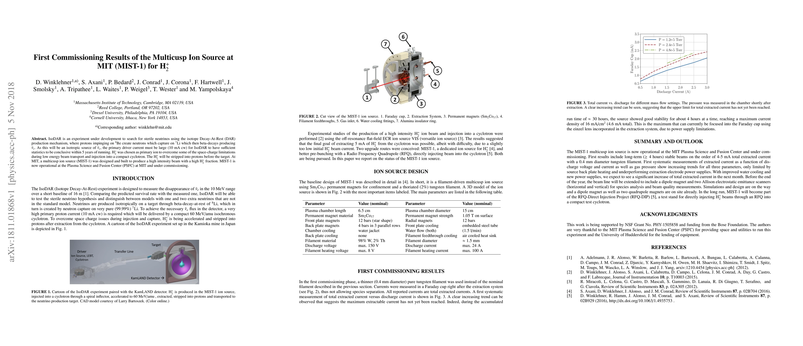 The paper reports on the initial results of the MIST-1 multicusp ion source at MIT, designed to produce high-intensity H$_2^+$ beams for the IsoDAR experiment aimed at detecting sterile neutrinos via an isotropic source of $\bar{\nu}_e$. The operational MIST-1 is now under commissioning to ensure sufficient beam current for conclusive results within five years.