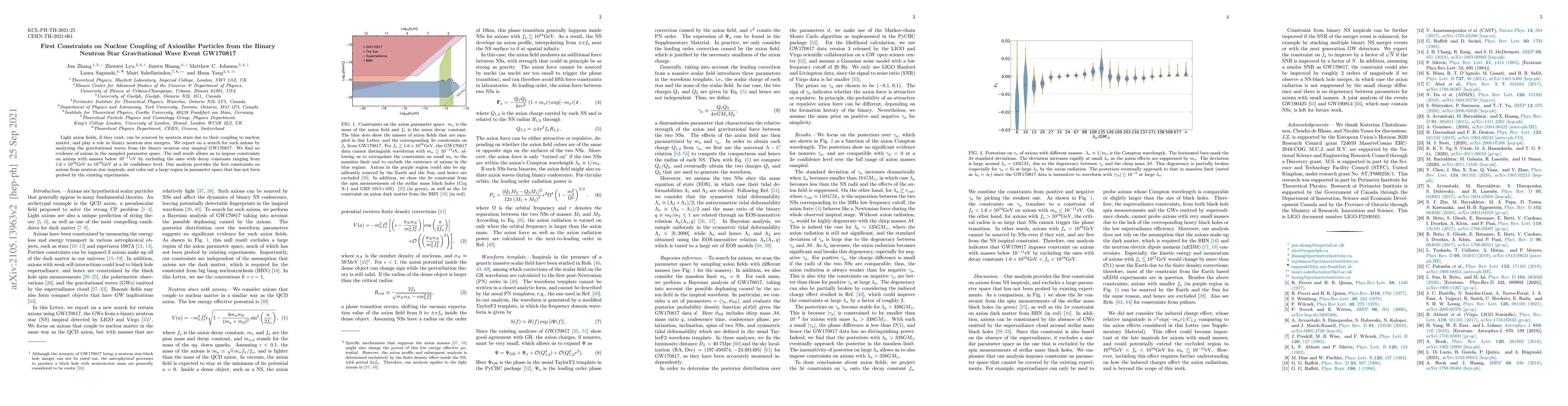 This paper reports the first constraints on axionlike particles from gravitational wave data of the binary neutron star merger GW170817, finding no evidence of axions. The study excludes axions with masses below $10^{-11} {\rm eV}$ and decay constants from $1.6\times10^{16} {\rm GeV}$ to $10^{18} {\rm GeV}$ at $3\sigma$ confidence level.