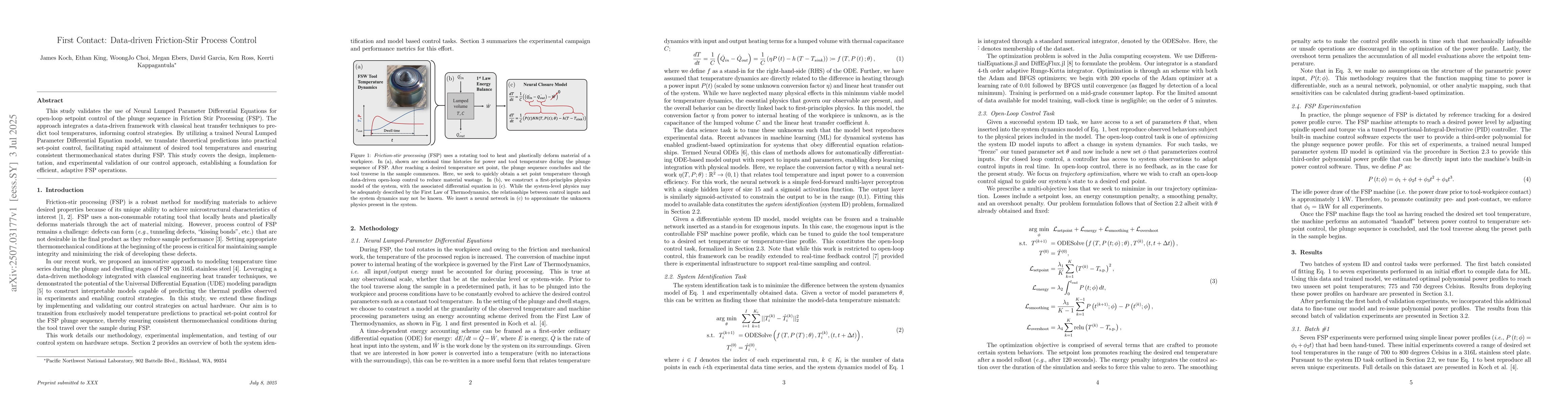 This study validates the use of Neural Lumped Parameter Differential Equations for open-loop setpoint control of the plunge sequence in Friction Stir Processing (FSP). The approach integrates a data-driven framework with classical heat transfer techniques to predict tool temperatures, informing control strategies. By utilizing a trained Neural Lumped Parameter Differential Equation model, we translate theoretical predictions into practical set-point control, facilitating rapid attainment of desired tool temperatures and ensuring consistent thermomechanical states during FSP. This study covers the design, implementation, and experimental validation of our control approach, establishing a foundation for efficient, adaptive FSP operations.