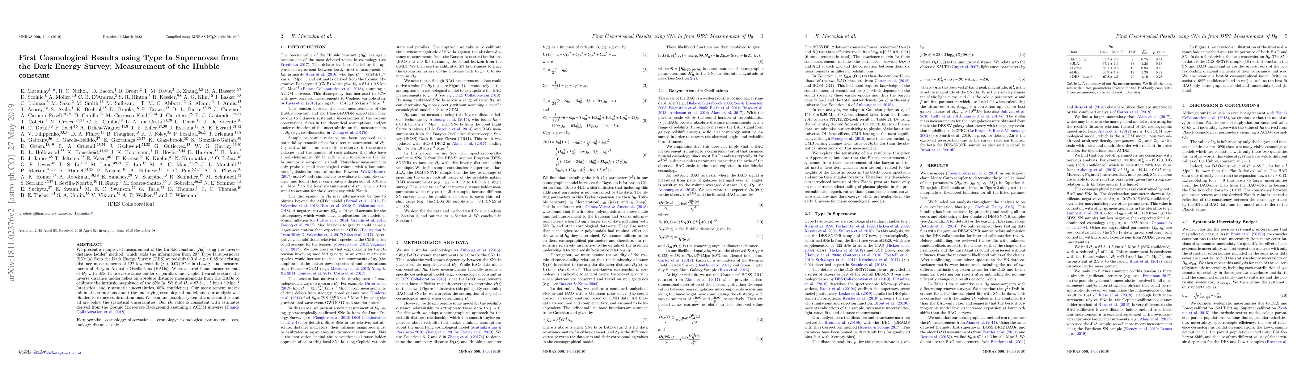 This paper reports an improved measurement of the Hubble constant (H_0) using 207 Type Ia supernovae from the Dark Energy Survey, employing an 'inverse distance ladder' method that calibrates supernovae magnitudes using Baryon Acoustic Oscillations. The result is H_0 = 67.8 +/- 1.3 km s-1 Mpc-1, consistent with estimates from the Cosmic Microwave Background.