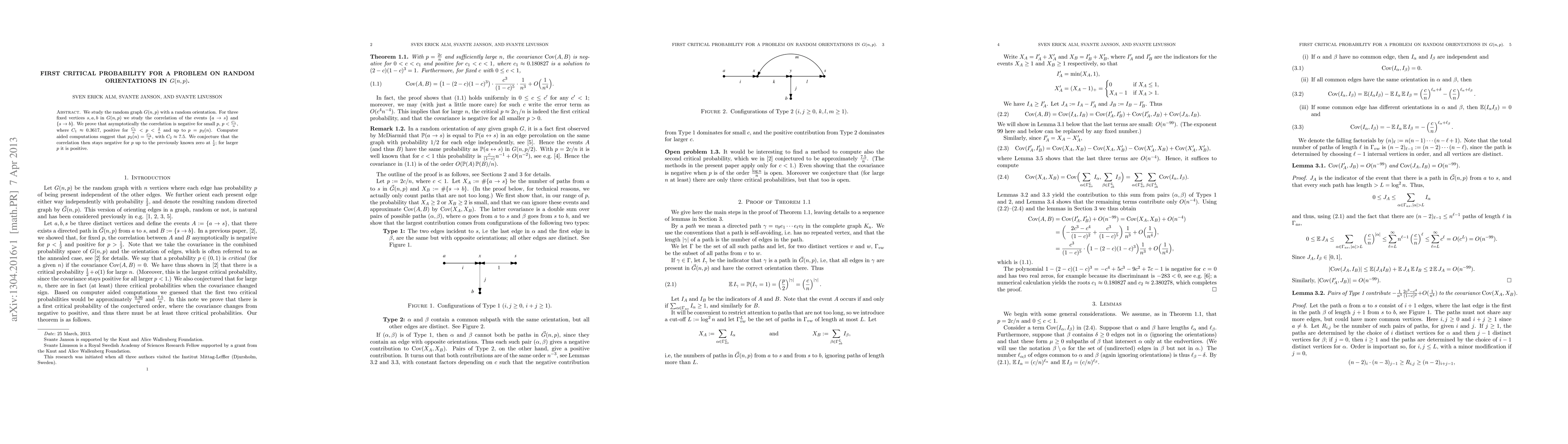 This paper investigates the correlation between directed paths in the random graph $G(n,p)$ with random orientations. It finds that the correlation between $a \to s$ and $s \to b$ is negative for small $p$, positive for intermediate $p$, and suggests a conjecture about the correlation behavior for larger $p$.