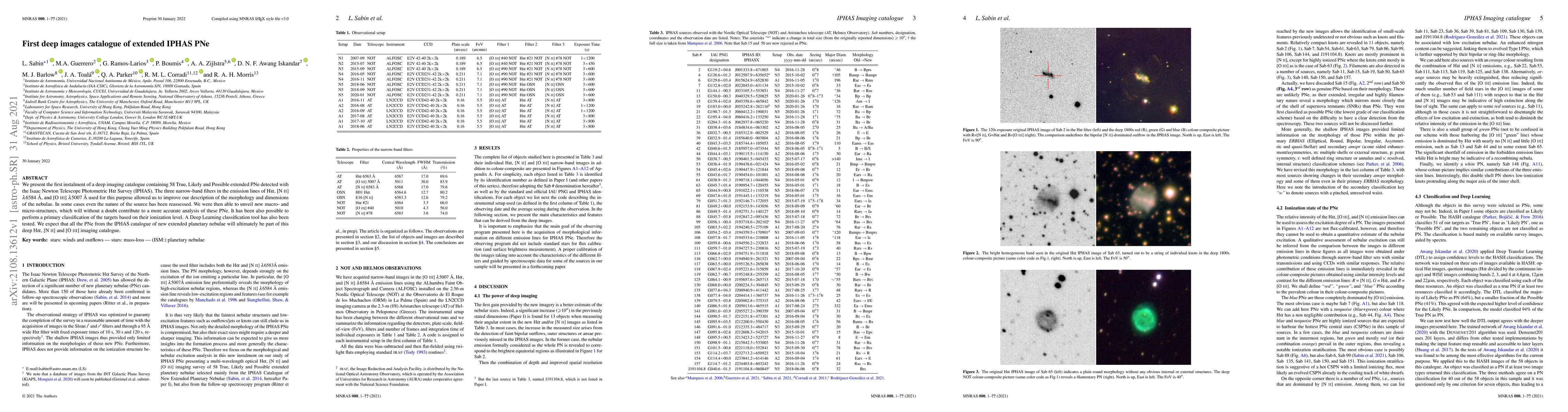 We present the first instalment of a deep imaging catalogue containing 58 True, Likely and Possible extended PNe detected with the Isaac Newton Telescope Photometric H$\alpha$ Survey (IPHAS). The three narrow-band filters in the emission lines of H$\alpha$, [N II] $\lambda$6584 \r{A} and [O III] $\lambda$5007 \r{A} used for this purpose allowed us to improve our description of the morphology and dimensions of the nebulae. In some cases even the nature of the source has been reassessed. We were then able to unveil new macro-and micro-structures, which will without a doubt contribute to a more accurate analysis of these PNe. It has been also possible to perform a primary classification of the targets based on their ionization level. A Deep Learning classification tool has also been tested. We expect that all the PNe from the IPHAS catalogue of new extended planetary nebulae will ultimately be part of this deep H$\alpha$, [N II] and [O III] imaging catalogue.