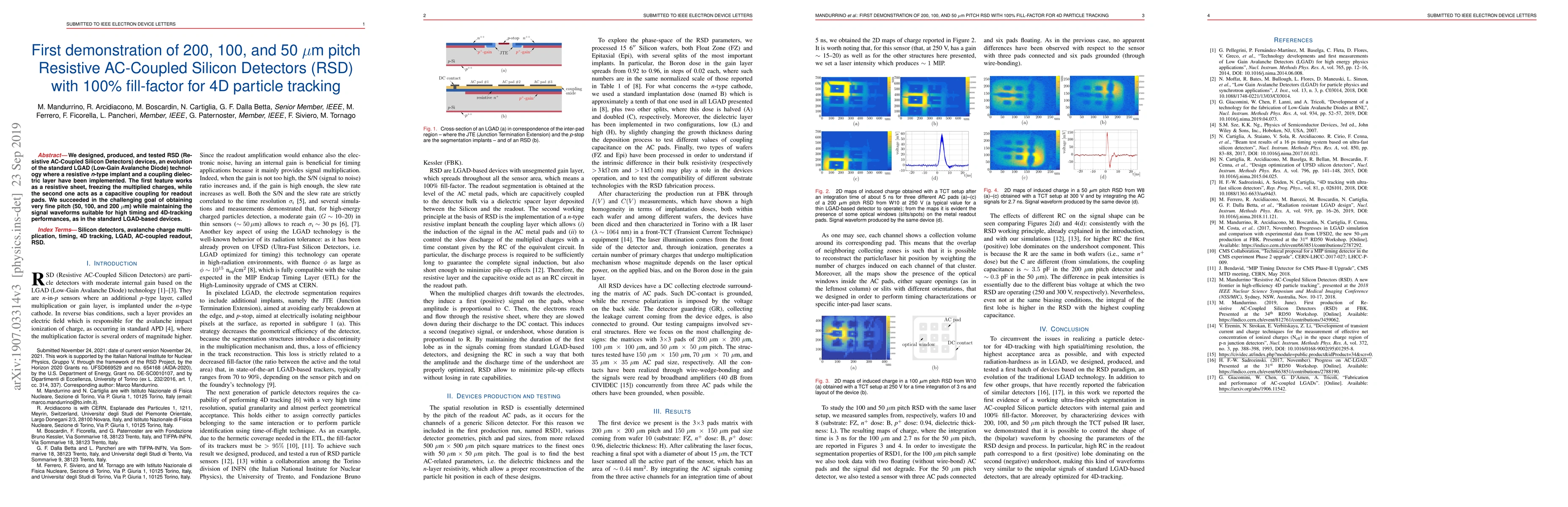 This paper presents the first demonstration of Resistive AC-Coupled Silicon Detectors (RSD) with pitches of 200, 100, and 50 µm featuring 100% fill-factor. The RSDs, an advancement over LGAD technology, utilize a resistive n-type implant and a coupling dielectric layer to achieve high timing and 4D-tracking performance.