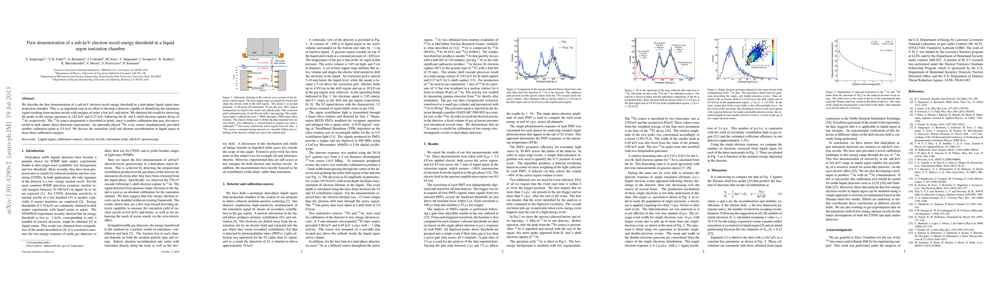 This paper reports the first demonstration of a sub-keV electron recoil energy threshold in a liquid argon ionization chamber, achieved by observing peaks in the energy spectrum from Ar-37 decay. The findings are crucial for developing detectors to identify nuclear recoils in dark matter detection experiments.