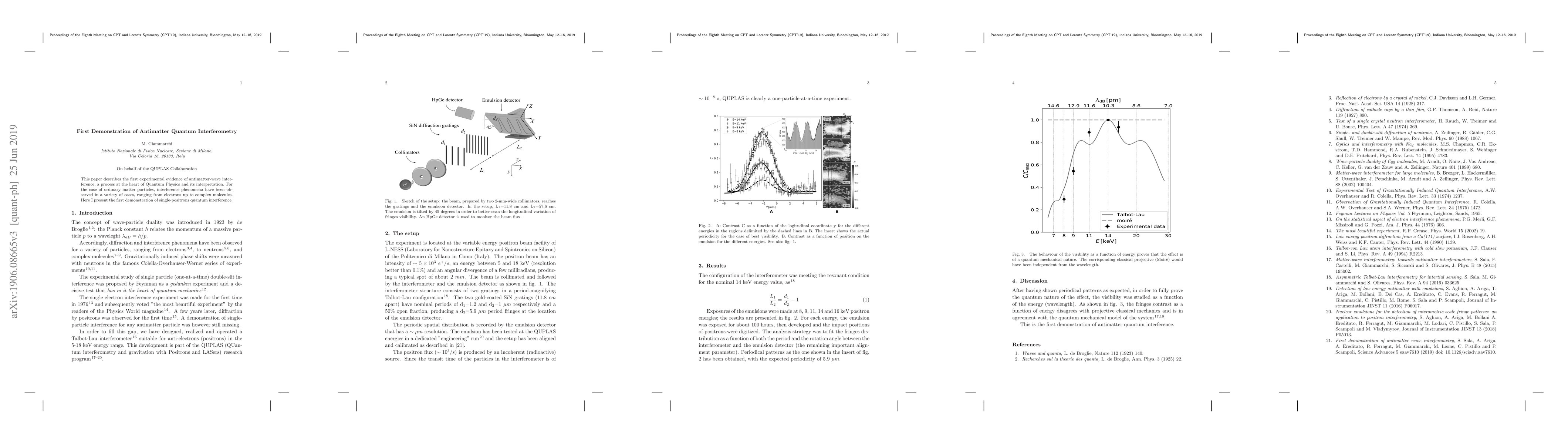 This paper descrives the first experimental evidence of antimatter-wave interference, a process at the heart of Quantum Physics and its interpretation. For the case of ordinary matter particles, interference phenomena have been observed in a variety of cases, ranging to electrons up to complex molecules. Here I present the first demonstration of single-positrons quantum interference.