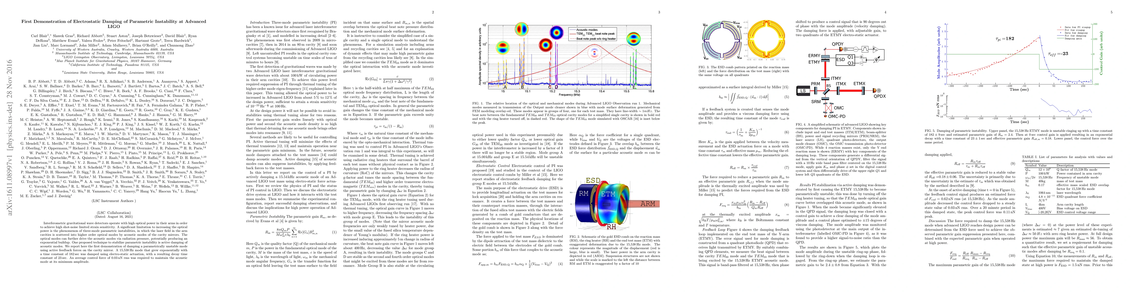 This paper reports the first successful demonstration of electrostatic damping of parametric instability in Advanced LIGO, stabilizing a 15,538 Hz mode that previously grew exponentially. The technique employed active feedback to reduce the instability, achieving a decay time constant of 23 seconds with an average control force of 0.03 nNrms.