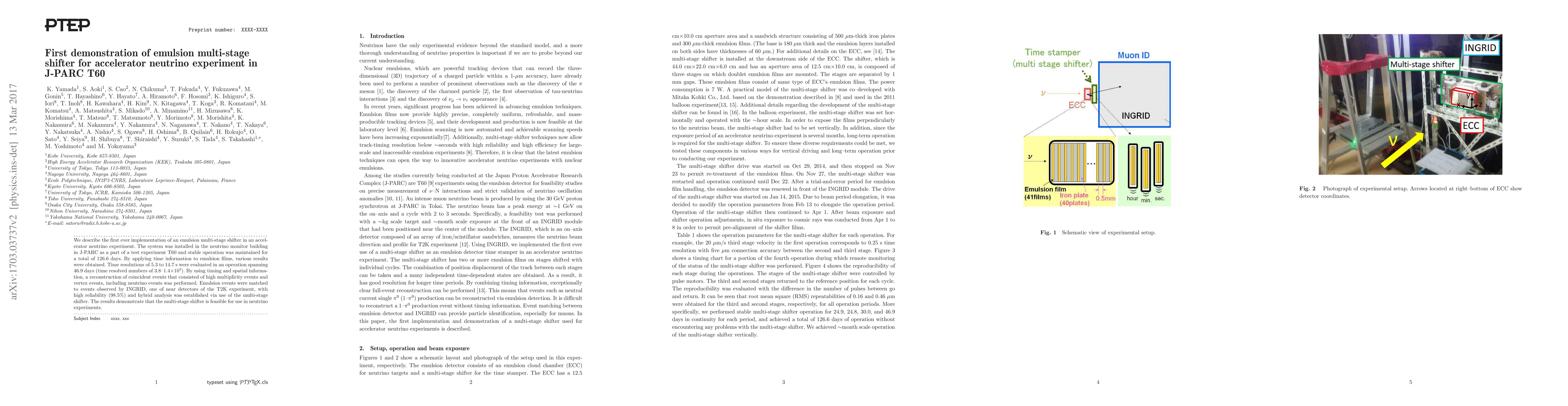 This paper reports the first implementation of an emulsion multi-stage shifter in an accelerator neutrino experiment at J-PARC T60, achieving stable operation for 126.6 days. The system successfully reconstructed high multiplicity and vertex events, including neutrino events, with 98.5% reliability when matched with INGRID detector data, demonstrating the shifter's feasibility for neutrino experiments.