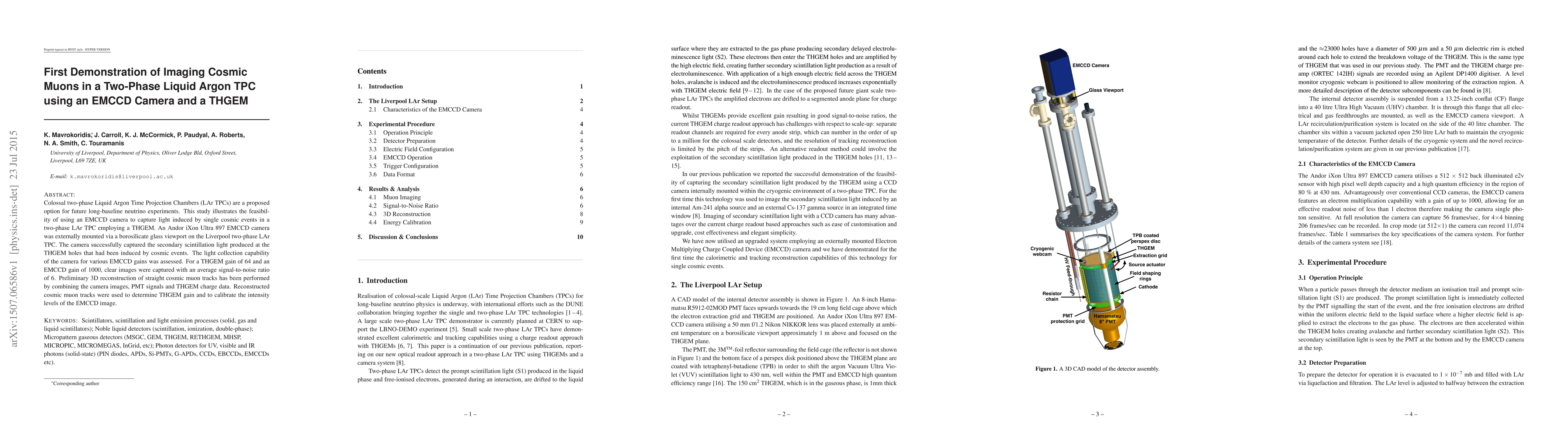 This study demonstrates the use of an EMCCD camera to capture light from cosmic muon events in a two-phase Liquid Argon TPC with a THGEM, achieving clear imaging and preliminary 3D reconstruction of muon tracks, indicating the potential for future long-baseline neutrino experiments.